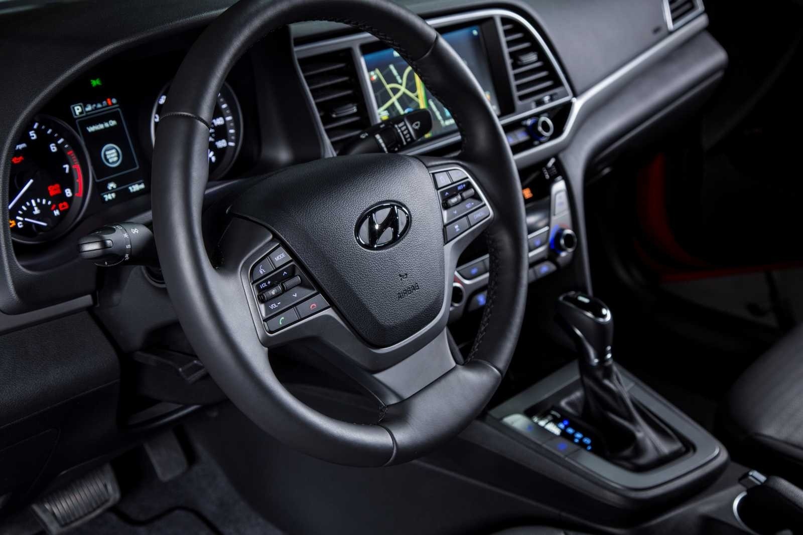 A view of the 2017 Hyundai Elantra's flat-bottom steering wheel with the Hyundai logo and multi-function controls, with the instrument cluster and infotainment screen visible in the background. The black interior is neatly laid out.