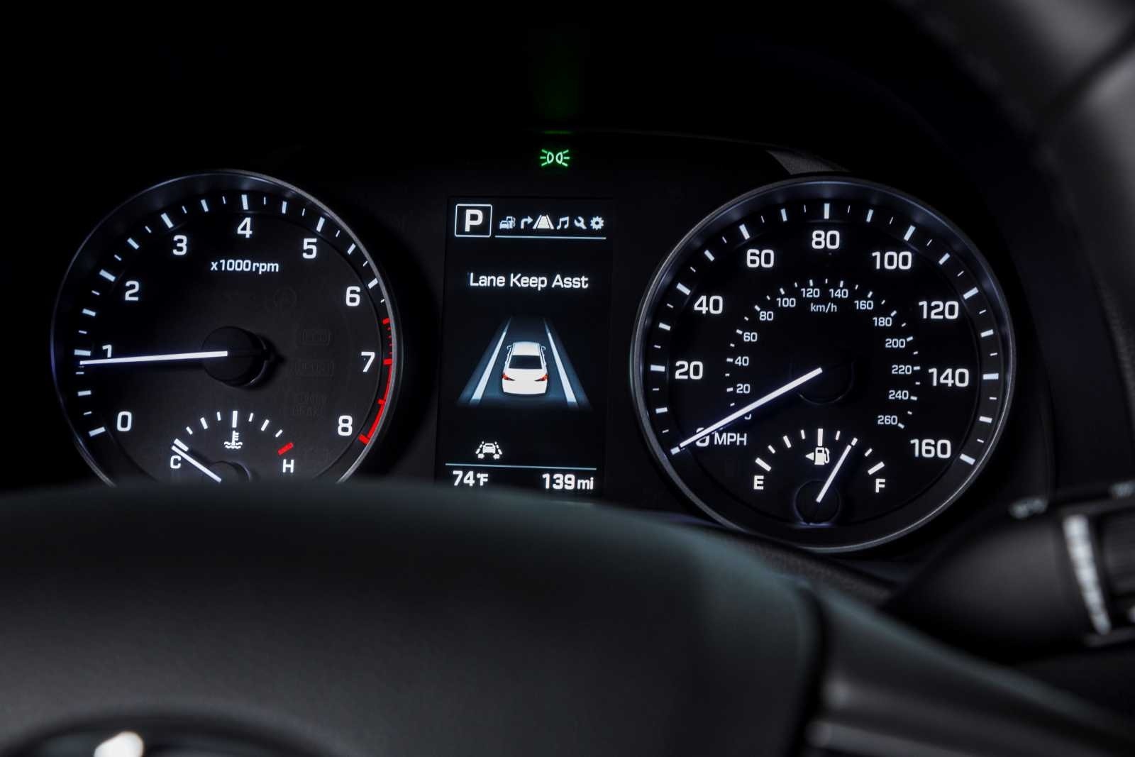 The 2017 Hyundai Elantra's instrument cluster showing the Lane Keep Assist System (LKAS) active display with a graphic of the car centered between lane markings. The feature is part of the standard driver assistance suite.