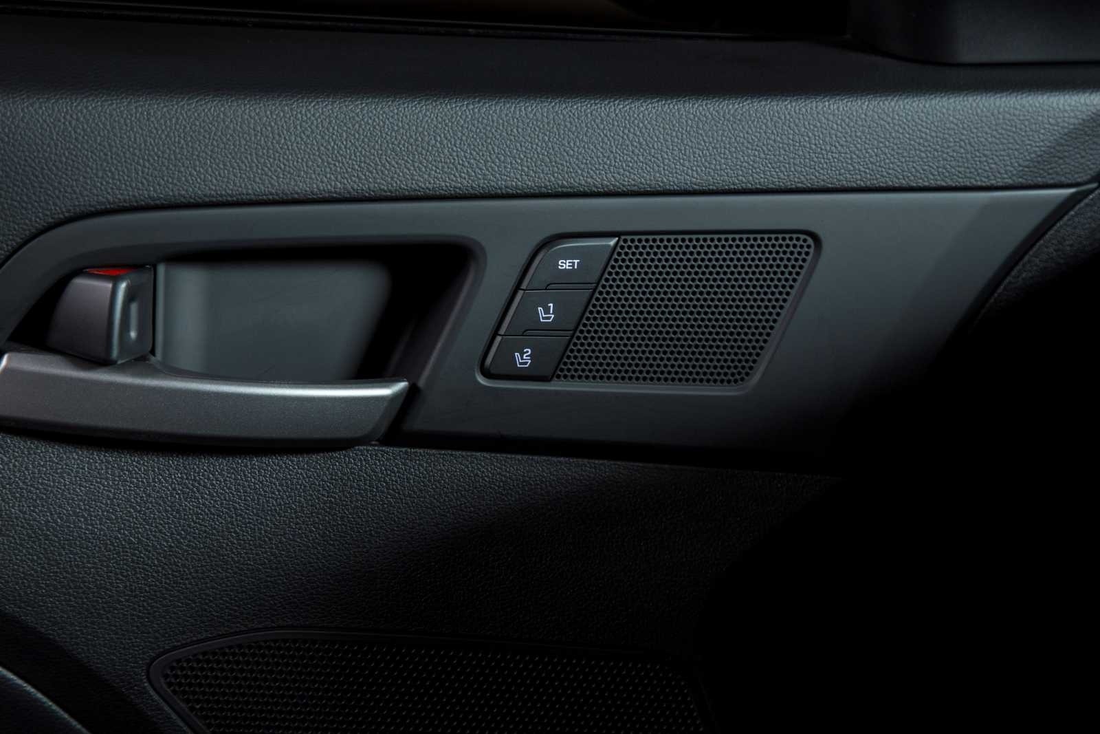 The driver's door panel of the 2017 Hyundai Elantra showing the memory seat position buttons with SET indicator and a door-mounted speaker. The dark leather door trim is clean and uncluttered.