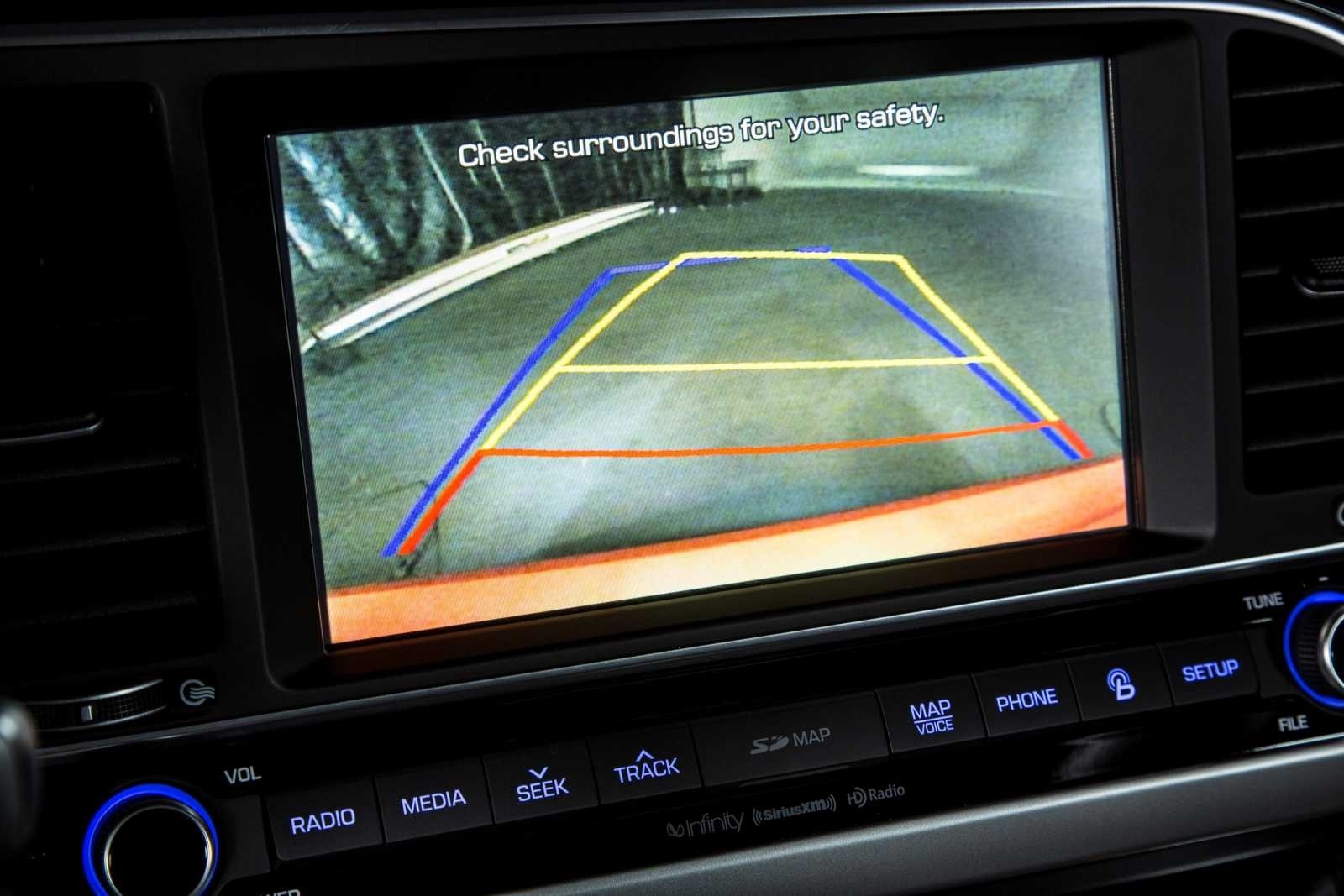 The 2017 Hyundai Elantra's infotainment screen displaying the rearview backup camera with colored parking guide lines. The audio system controls including radio, media, and seek buttons are visible below the screen.
