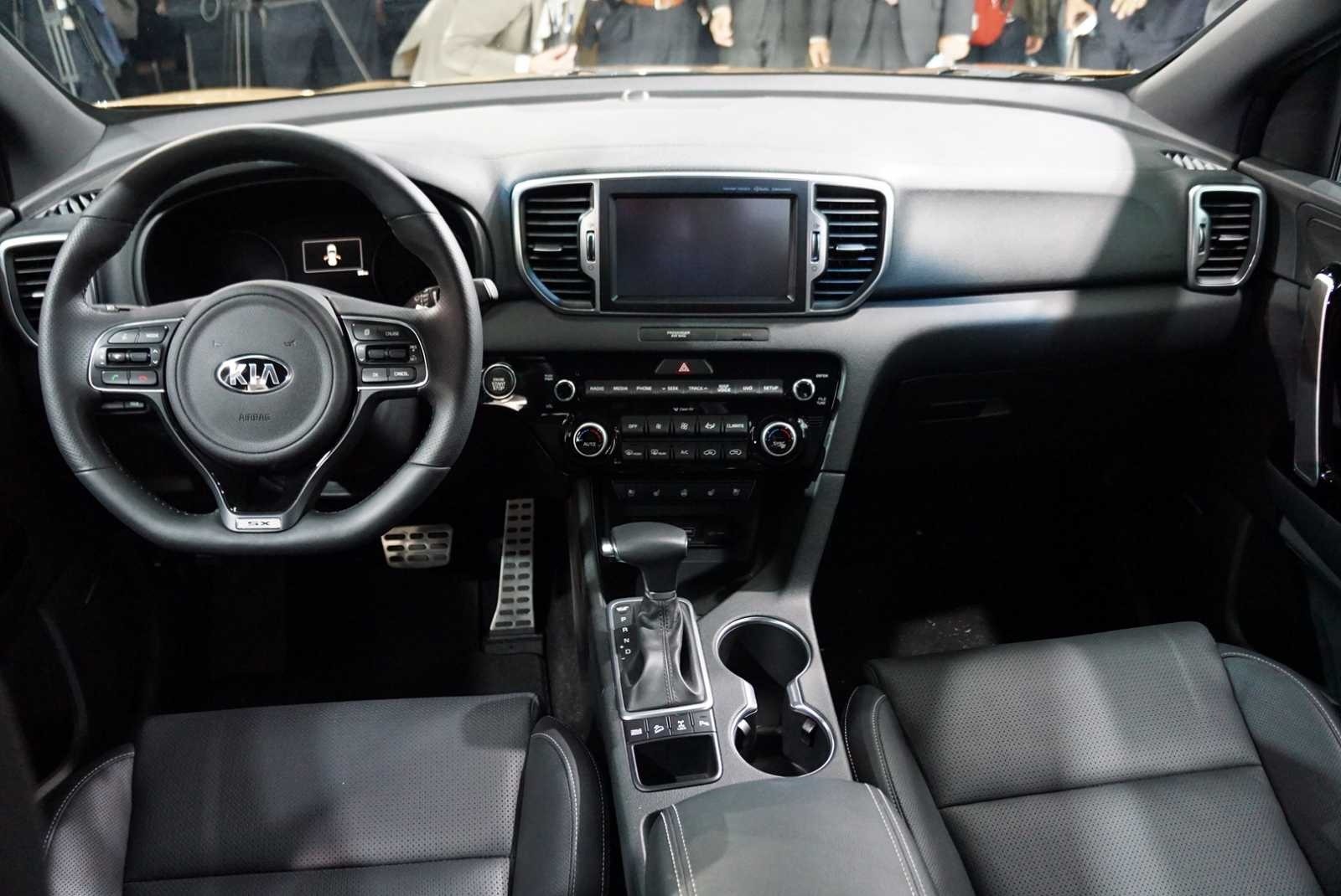 Full dashboard view of the 2017 Kia Sportage at the LA Auto Show, showing the steering wheel with Kia logo, infotainment screen, HVAC controls, center console with automatic shifter, and black leather front seats.