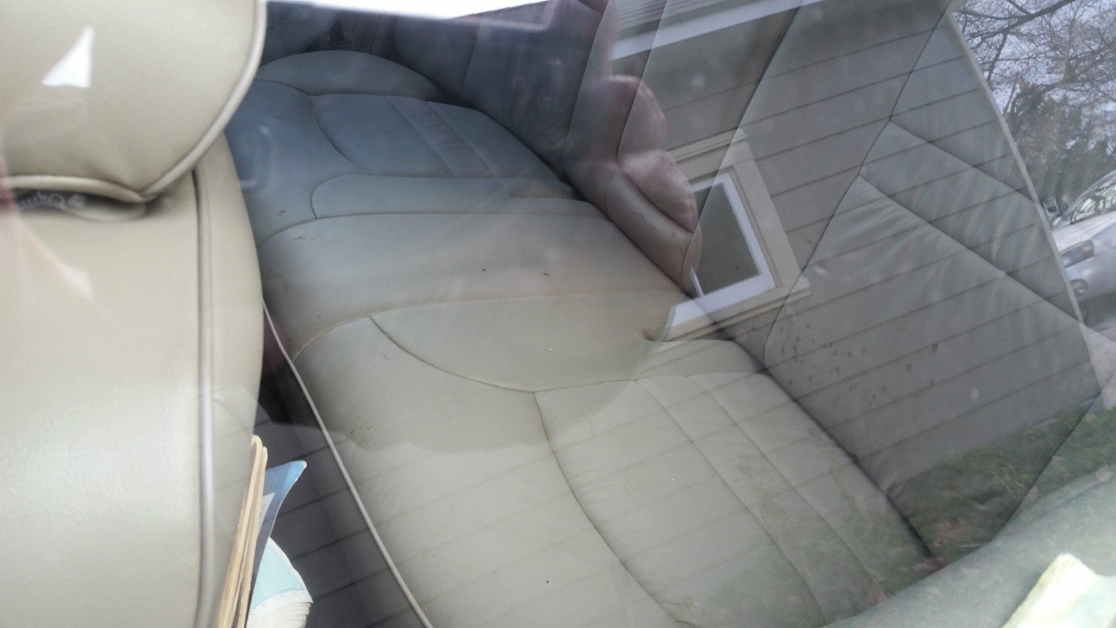 Photographed through the rear side window, the 1999 Mercury Grand Marquis Wagon's rear bench seat shows the tan leather upholstery with stitched seat cushions. The rear quarter window is also visible in this cabin view.