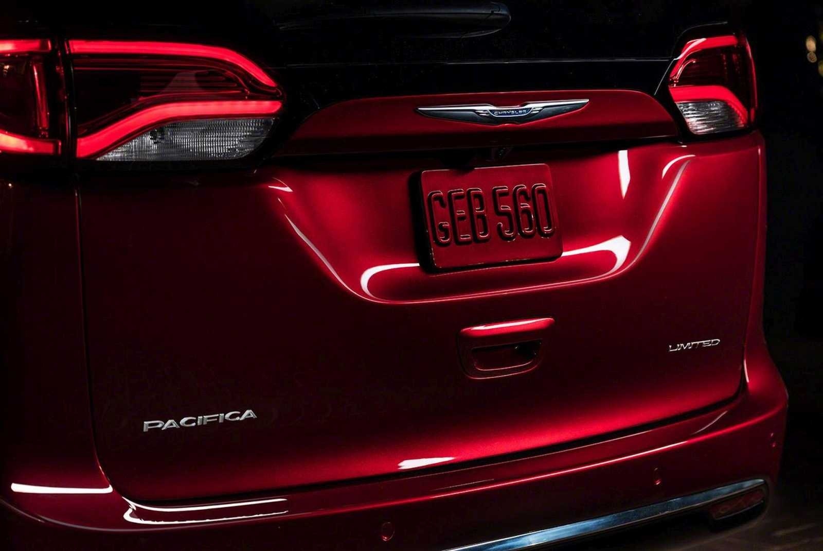 A dramatic low-light close-up highlights the Pacifica and Limited badges on the rear liftgate, framed by glowing full-width LED taillamps. The Chrysler wing badge sits prominently above the license plate recess on the top-trim Limited model.