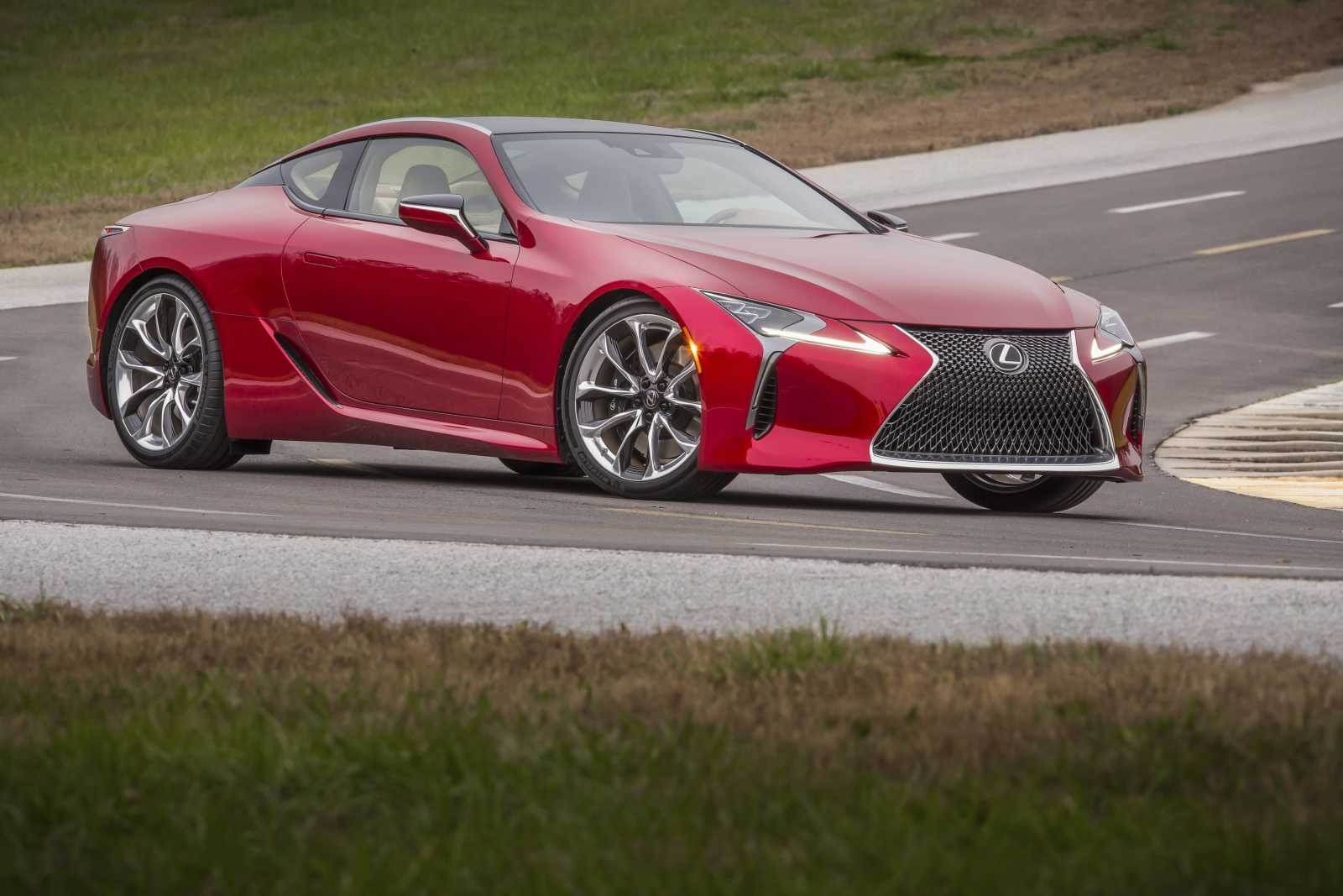 The 2017 Lexus LC 500 navigates a tight circuit corner, its wide stance and large multi-spoke wheels gripping the track surface. The sculpted body creases and side air intakes are highlighted from this front three-quarter perspective as the coupe rounds the bend.