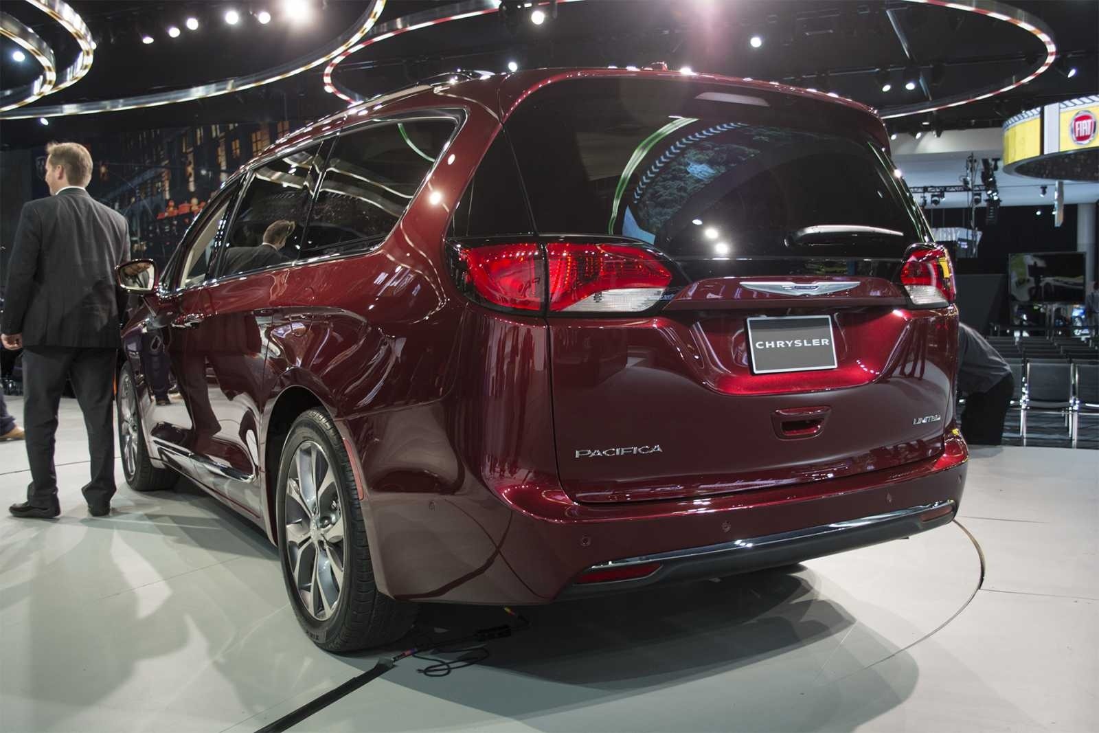 2017 Chrysler Pacifica Hybrid rear three-quarter view at auto show with plug-in charging cable visible