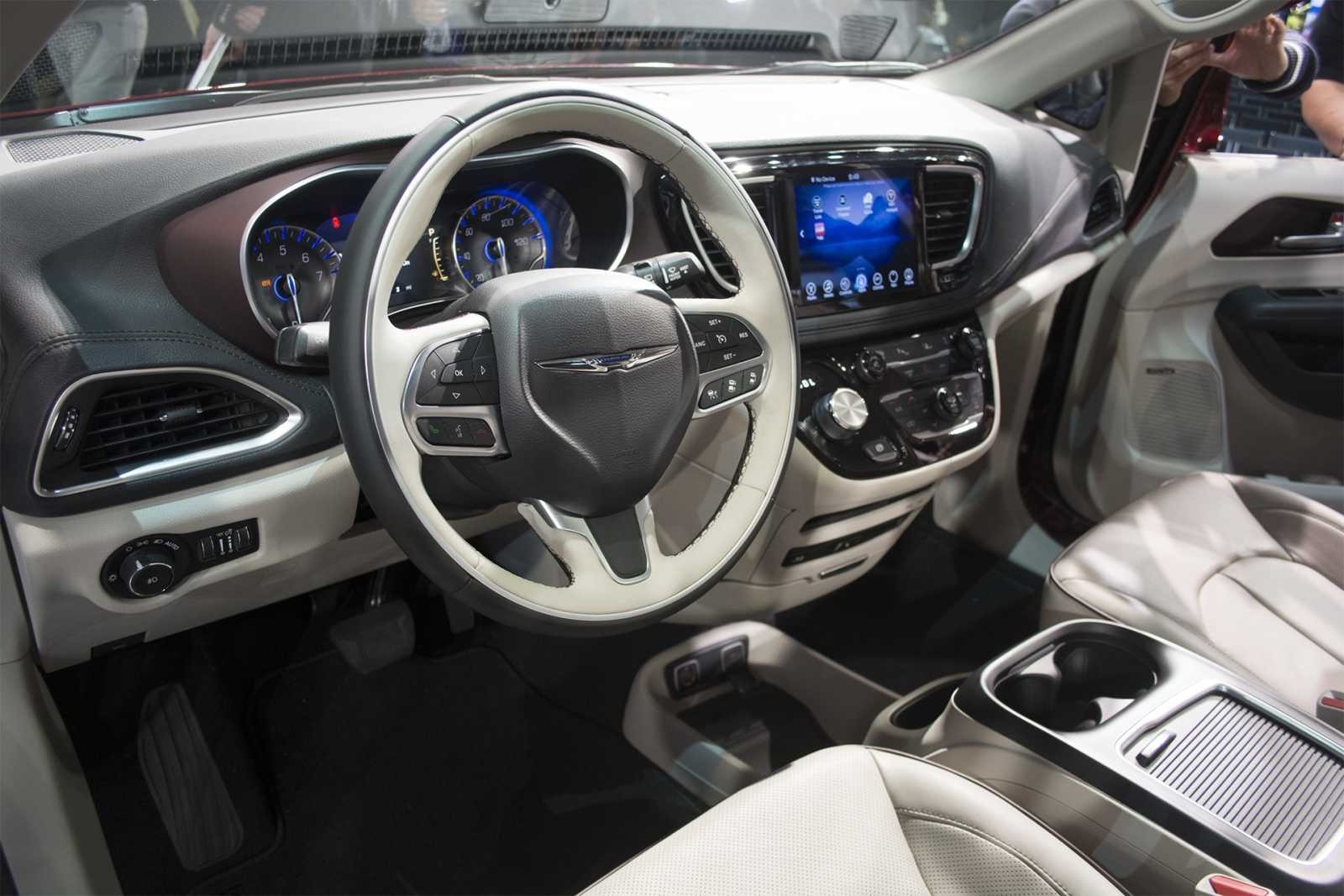 Inside the 2017 Pacifica Hybrid, a cream and black two-tone cabin greets passengers with a soft-touch steering wheel wearing the Chrysler wing logo, a crisp Uconnect touchscreen, and an instrument cluster that displays hybrid system status alongside conventional gauges. It's a significant step up in perceived quality from the Town and Country it replaced.