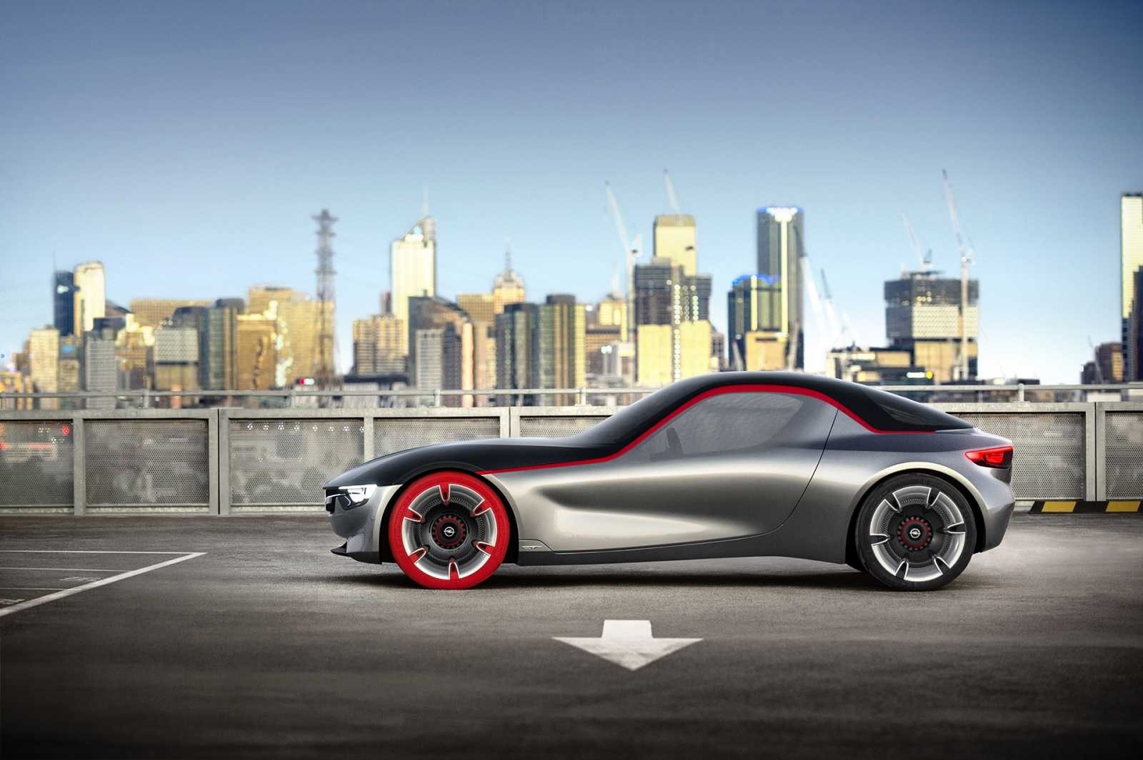 The 2016 Opel GT Concept stands in static side profile on a rooftop parking structure, a city skyline and construction cranes filling the background behind it. The red roofline accent strip, sculpted silver bodywork, and signature red-rimmed spider-spoke wheels are all cleanly framed against the blue sky.