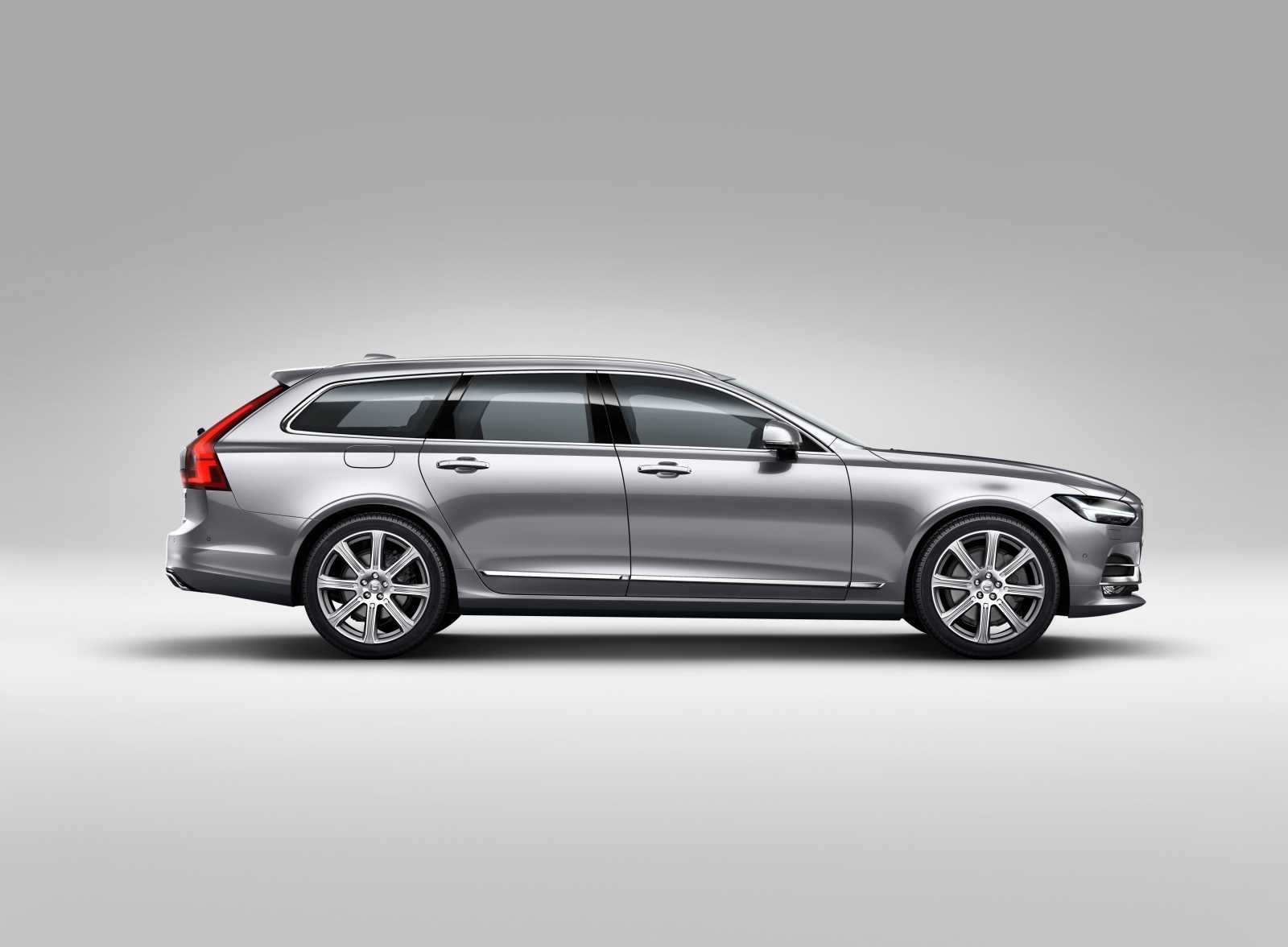 Studio side profile of the 2017 Volvo V90 wagon in silver from the passenger's side, facing left. This angle prominently shows the red C-pillar accent, the long rear overhang, multi-spoke wheels, sculpted lower sill, and the expansive greenhouse that make the V90's wagon proportions so distinctive.