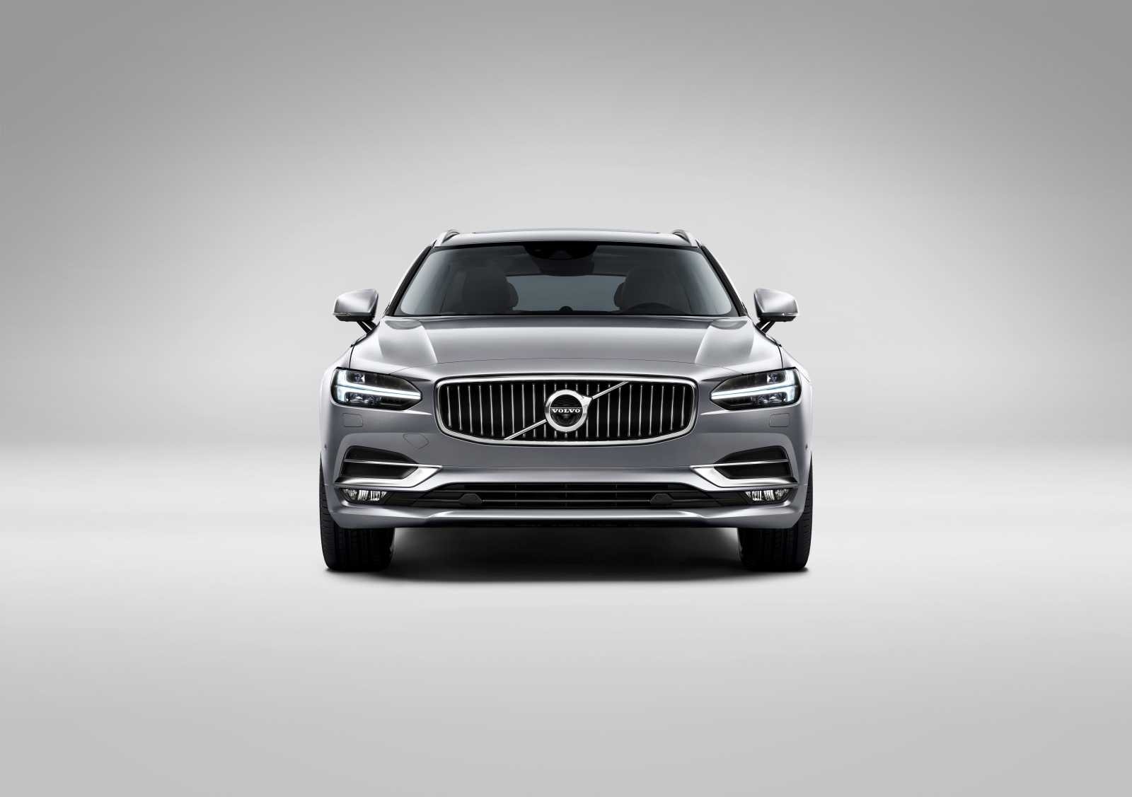 Head-on studio photograph of the 2017 Volvo V90 wagon in silver against a light grey gradient backdrop, showcasing the vertical-bar grille with the Volvo iron mark badge, Thor's Hammer LED daytime running lights integrated into the headlights, and the wide front bumper with lower air intakes.