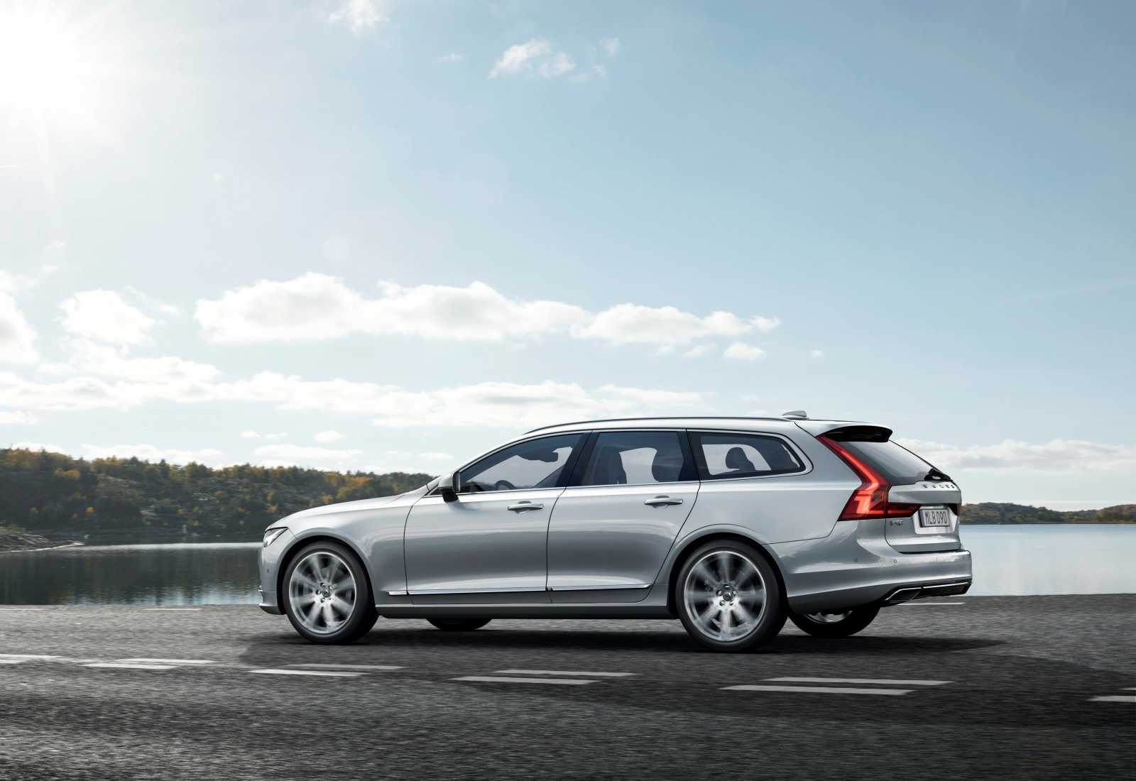 The 2017 Volvo V90 wagon in silver metallic photographed from the rear three-quarter angle beside a still lake with autumn foliage in the background. The distinctive Thor's Hammer LED taillights, integrated rear spoiler, and VOLVO badge on the tailgate are clearly visible.