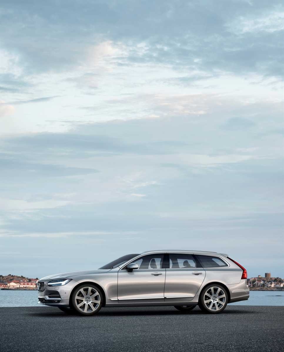 A portrait-oriented press photo of the 2017 Volvo V90 wagon in silver metallic, shown in full driver-side profile at a waterfront with a Swedish coastal village and overcast sky in the background. The V90's long wagon roofline and multi-spoke alloy wheels are prominently featured.