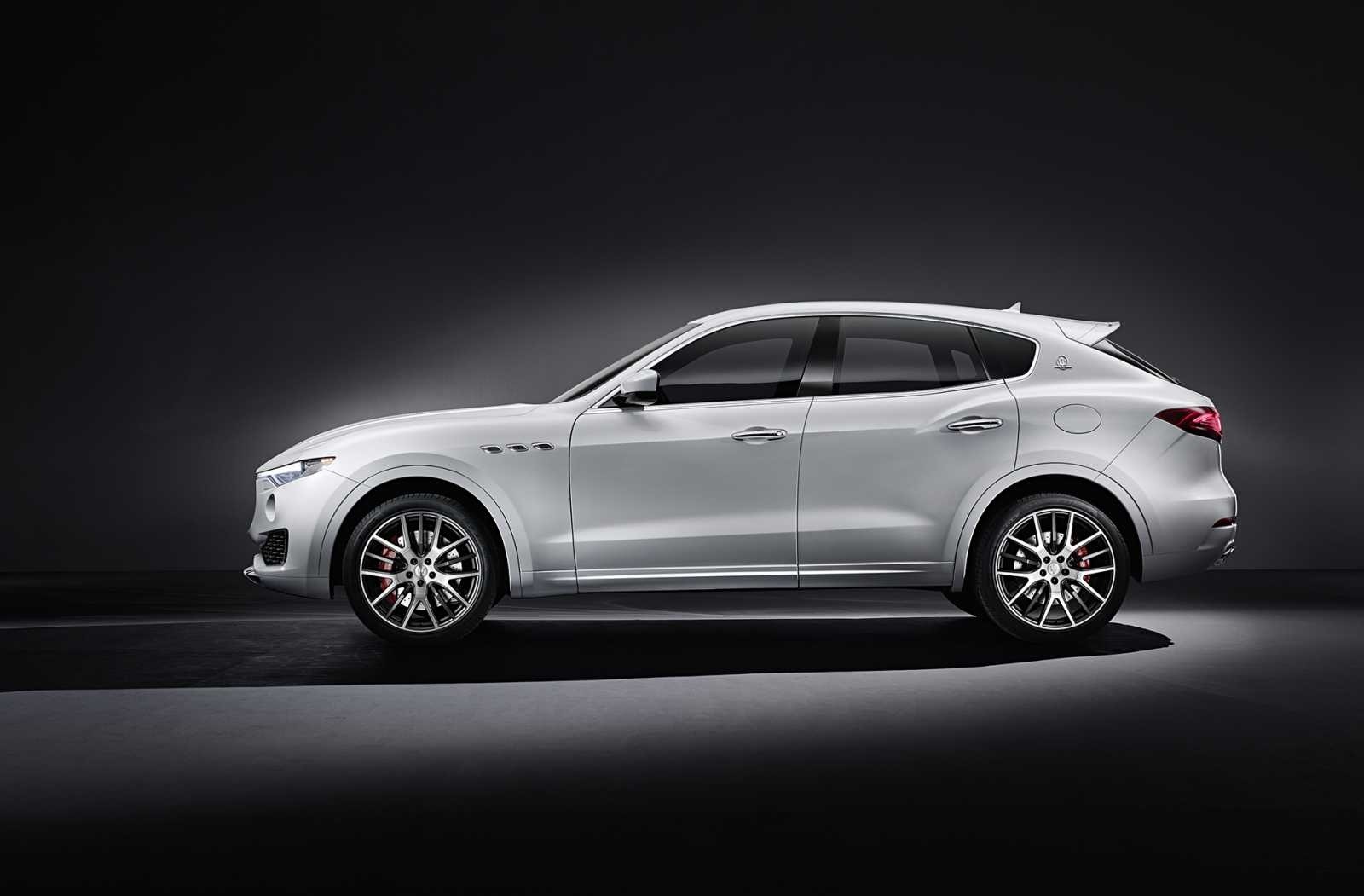 A white 2017 Maserati Levante is presented in full side profile against a dark studio background with dramatic side lighting that emphasizes the SUV's long hood, sloping fastback roofline, and three-vent fender emblem. Red brake calipers are clearly visible behind the multi-spoke alloy wheels at both axles, reinforcing the performance character of Maserati's first production SUV.