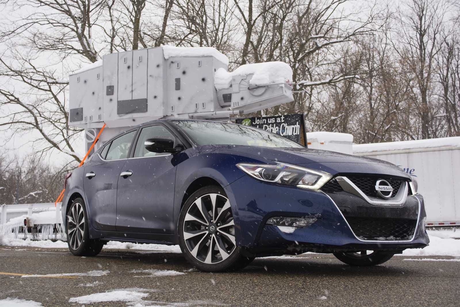 2016 Nissan Maxima SR Front Three-Quarter View in Winter Snow