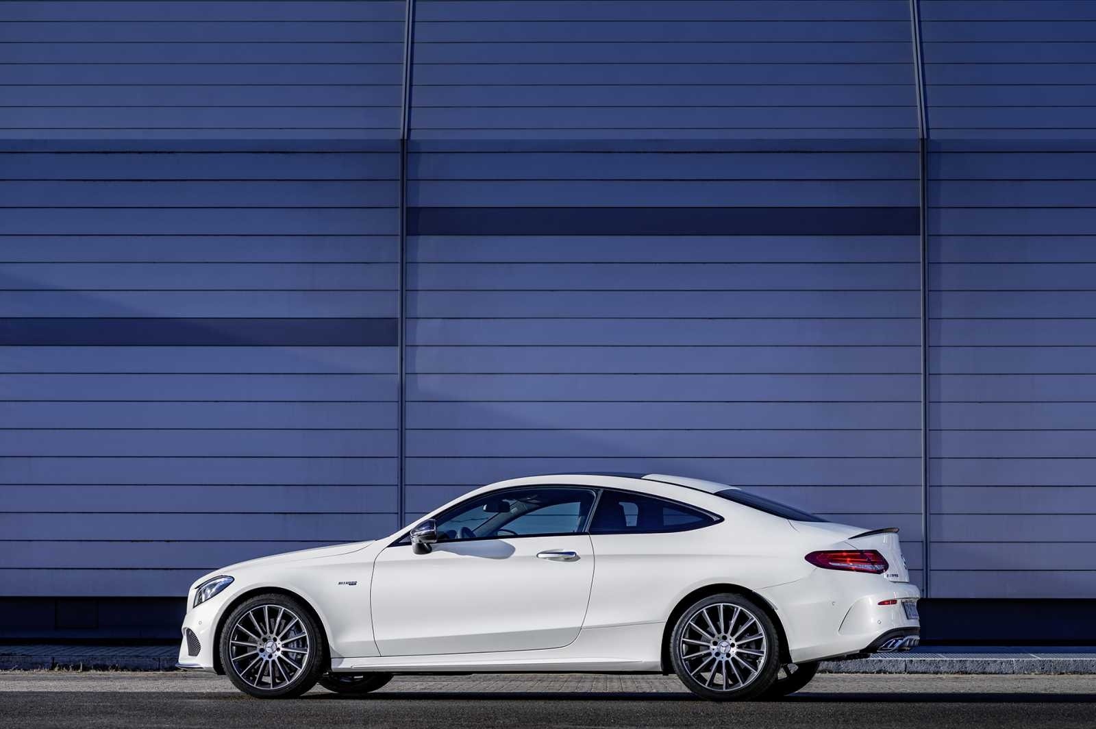 The 2017 Mercedes-AMG C43 Coupe is photographed in full side profile in white against a blue slatted wall, showcasing the two-door coupe roofline, flush door handles, and AMG multi-spoke wheels.