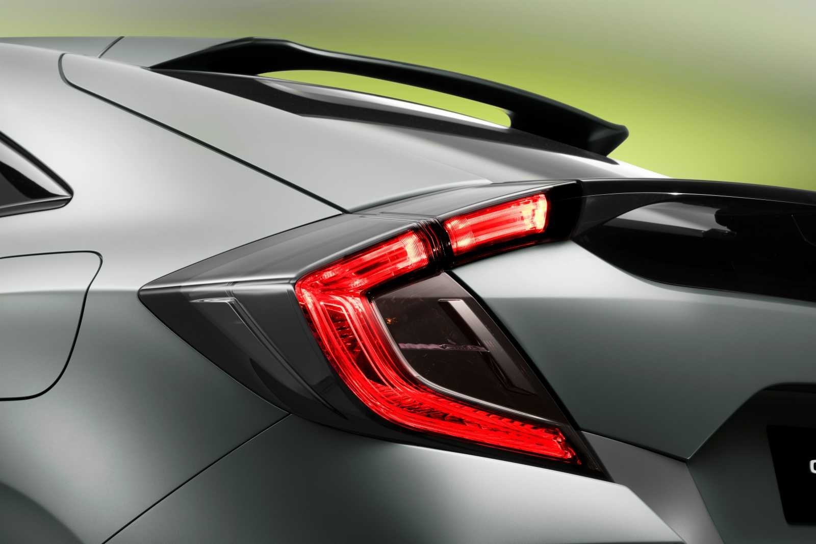 A studio close-up of the Honda Civic Hatchback Prototype's angular LED taillamp and integrated roofline spoiler, showcasing the dramatic sculpting on the rear quarter panel. The geometric light signature and sloped glasshouse reinforce the prototype's sporty, wedge-driven silhouette.