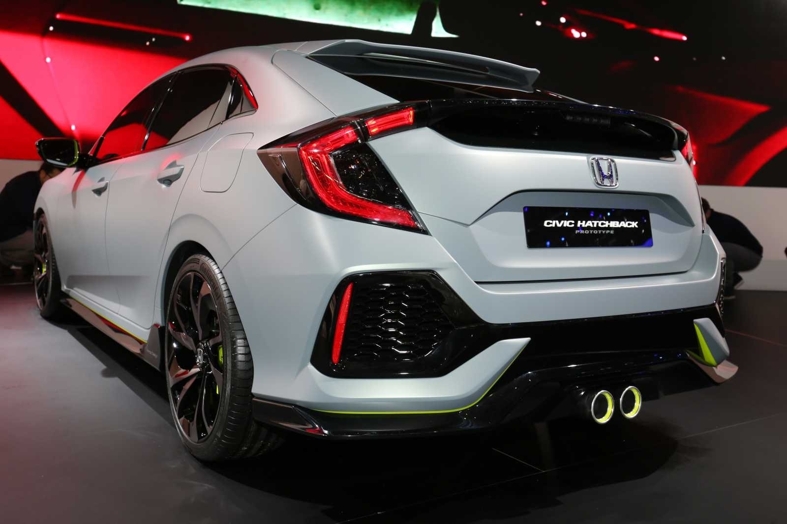 A close-up rear view of the Honda Civic Hatchback Prototype on the Geneva show floor, with the "Civic Hatchback Prototype" badge prominently displayed on the tailgate and the twin exhaust outlets ringed in neon-green visible below. The geometric taillamps and aggressive diffuser treatment confirm the prototype's performance-focused design intent.