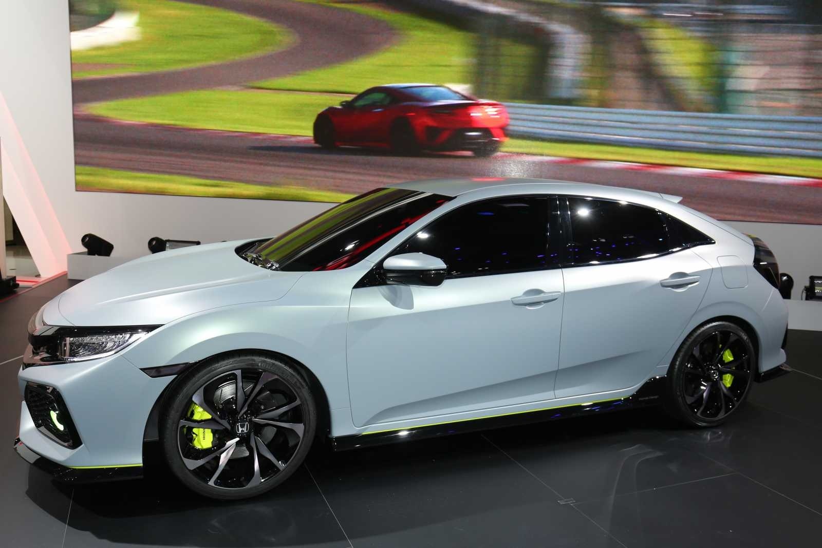 A side view of the Honda Civic Hatchback Prototype on the Geneva show floor, posed in front of a large Honda motorsport backdrop featuring a red race car on track. The prototype's clean hatchback roofline, bright green fog light rings, and neon-yellow calipers stand out against the dramatic display environment.