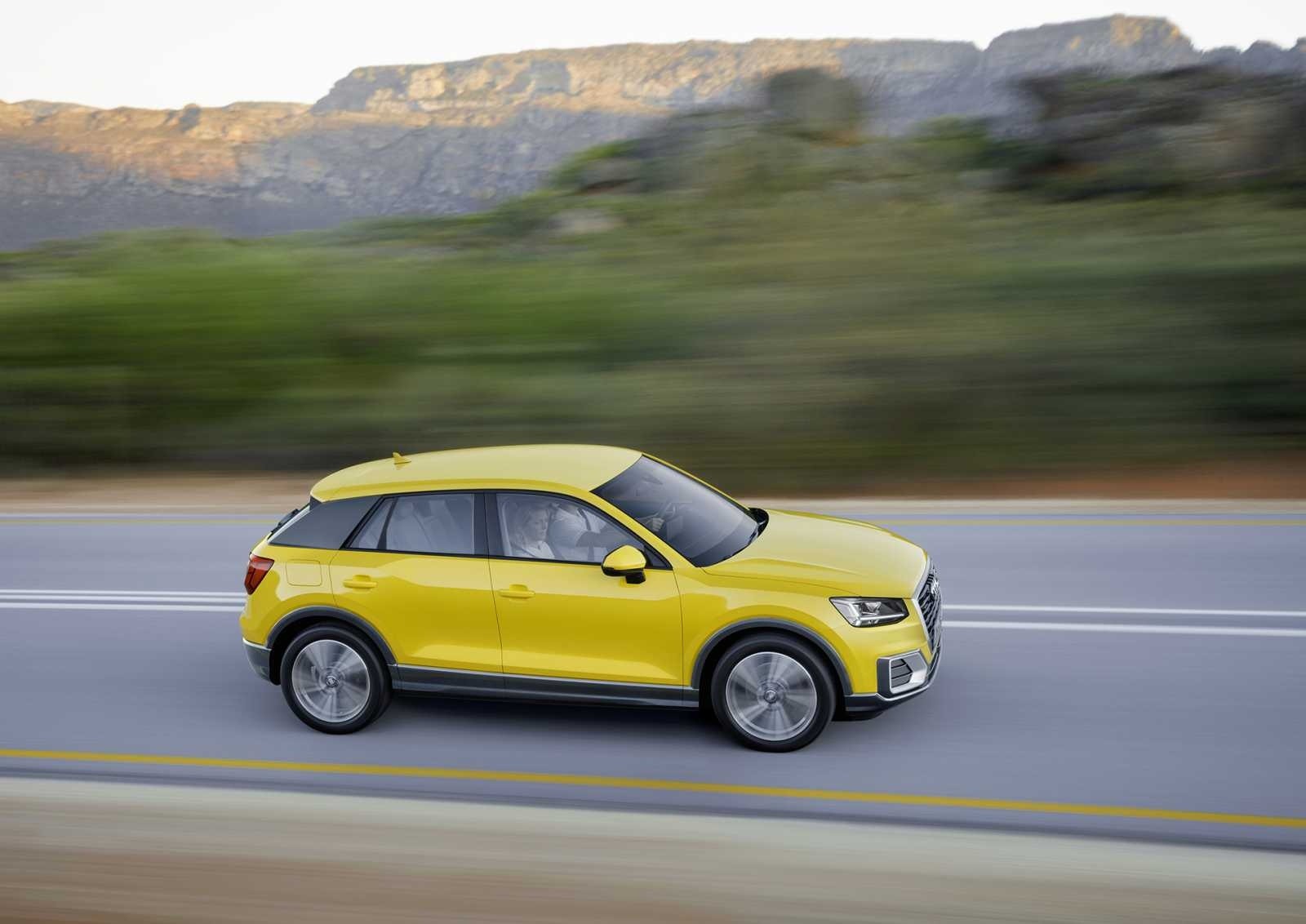The 2017 Audi Q2 is captured in profile while driving on a highway with a blurred mountain landscape behind it. The clean side profile reveals the sloping roofline, large greenhouse, and distinctive C-pillar treatment that give this compact crossover a coupe-like appearance.