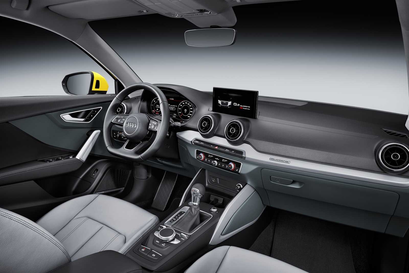 The 2017 Audi Q2 cockpit shows the driver-focused dashboard layout with the MMI infotainment display mounted high on the center stack. The three-spoke steering wheel, analog gauges, center-mounted air vents, and automatic transmission shifter are all clearly visible.
