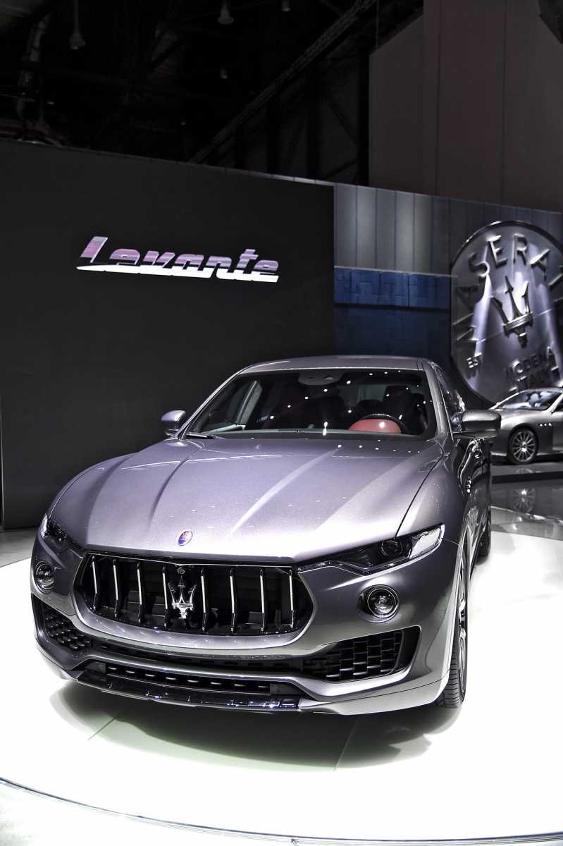 Direct front view of the 2017 Maserati Levante in dark gray metallic at its world debut at the 2016 Geneva Motor Show. The vertical-bar trident grille dominates the front fascia, flanked by swept LED headlights and a wide lower air intake. The "Levante" script logo is displayed on the backdrop behind the car and a large Maserati trident medallion hangs to the right. Red leather is just visible through the windshield.