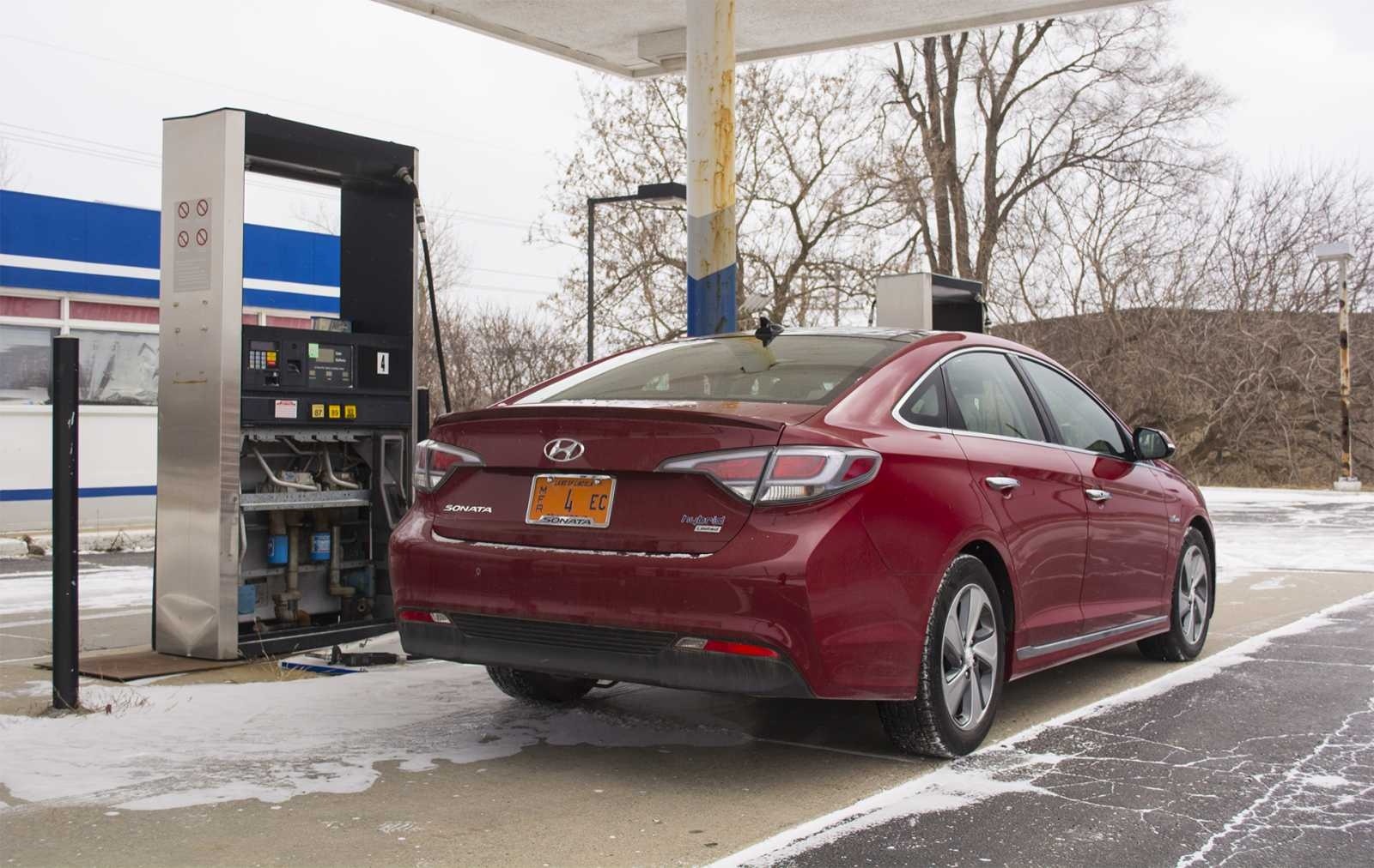 2016 Hyundai Sonata Hybrid Limited, Rear Three-Quarter at Gas Station