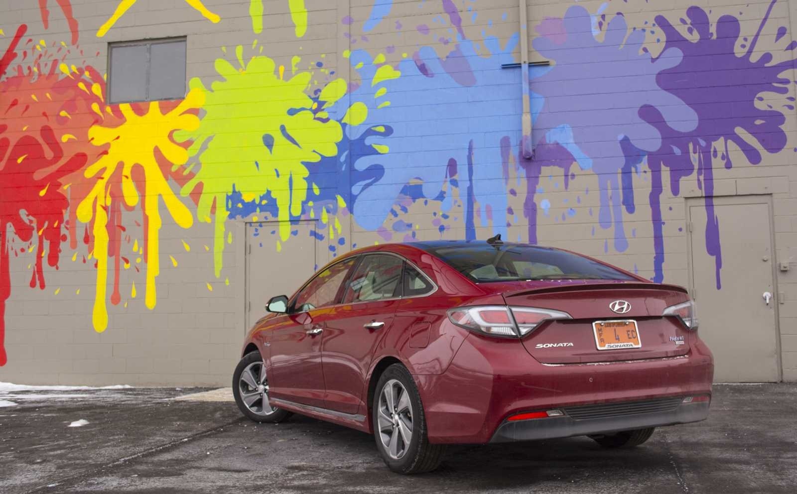 2016 Hyundai Sonata Hybrid Limited, Rear Three-Quarter Against Mural