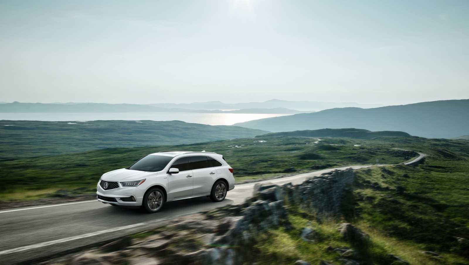 The 2017 Acura MDX is captured in motion on a winding coastal mountain road with sweeping ocean and valley views. The white exterior and sport alloy wheels stand out against the lush green landscape as the three-row luxury SUV showcases its dynamic profile.