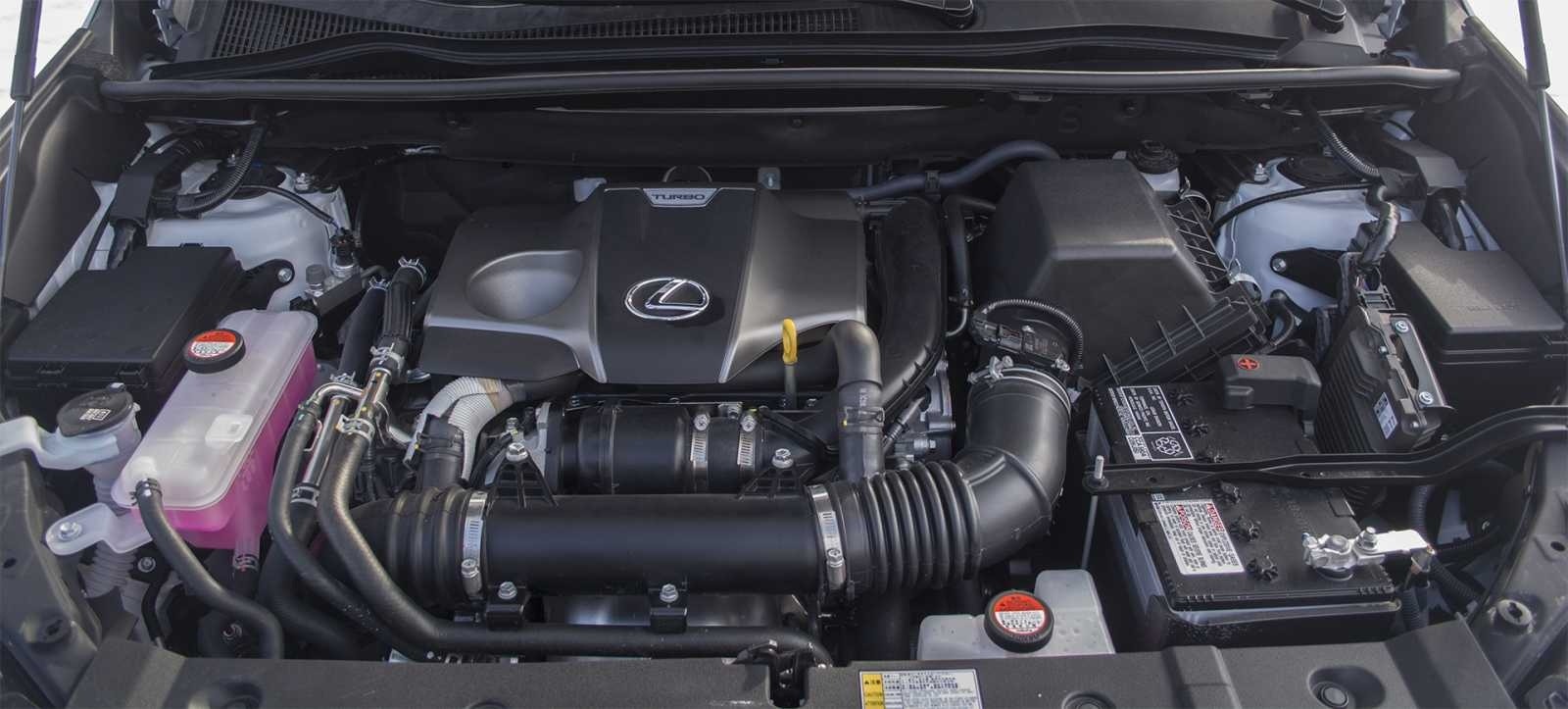 The engine bay of the 2016 Lexus NX 200t F-Sport reveals the turbocharged 2.0-liter four-cylinder engine, identifiable by the Lexus badge on the valve cover and the TURBO-labeled intake. Ancillary components including the coolant reservoir, air intake tube, and battery are neatly arranged in the compact engine compartment.