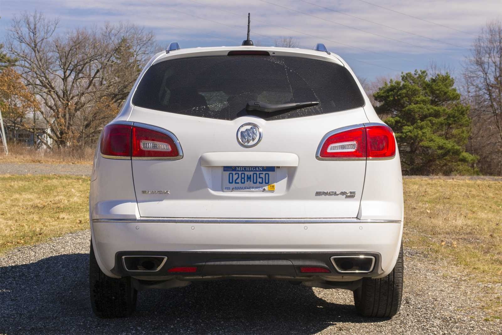 The rear of the 2016 Buick Enclave Premium AWD shows the wide LED-accented taillights, chrome Buick badge and Enclave lettering on the liftgate, and dual trapezoidal exhaust tips flanking a black lower diffuser. The Michigan press plate and clean rear proportions are visible in this straight-on shot.