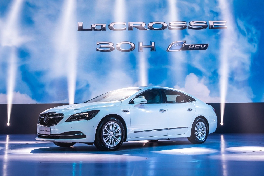 The Buick LaCrosse Hybrid takes center stage at its official reveal, positioned beneath bold "LaCrosse 30H eHEV" branding as dramatic lighting washes over the white sedan. The reveal setting highlights the significance of the 30H hybrid variant as Buick's electrification push into the Chinese market gained momentum.