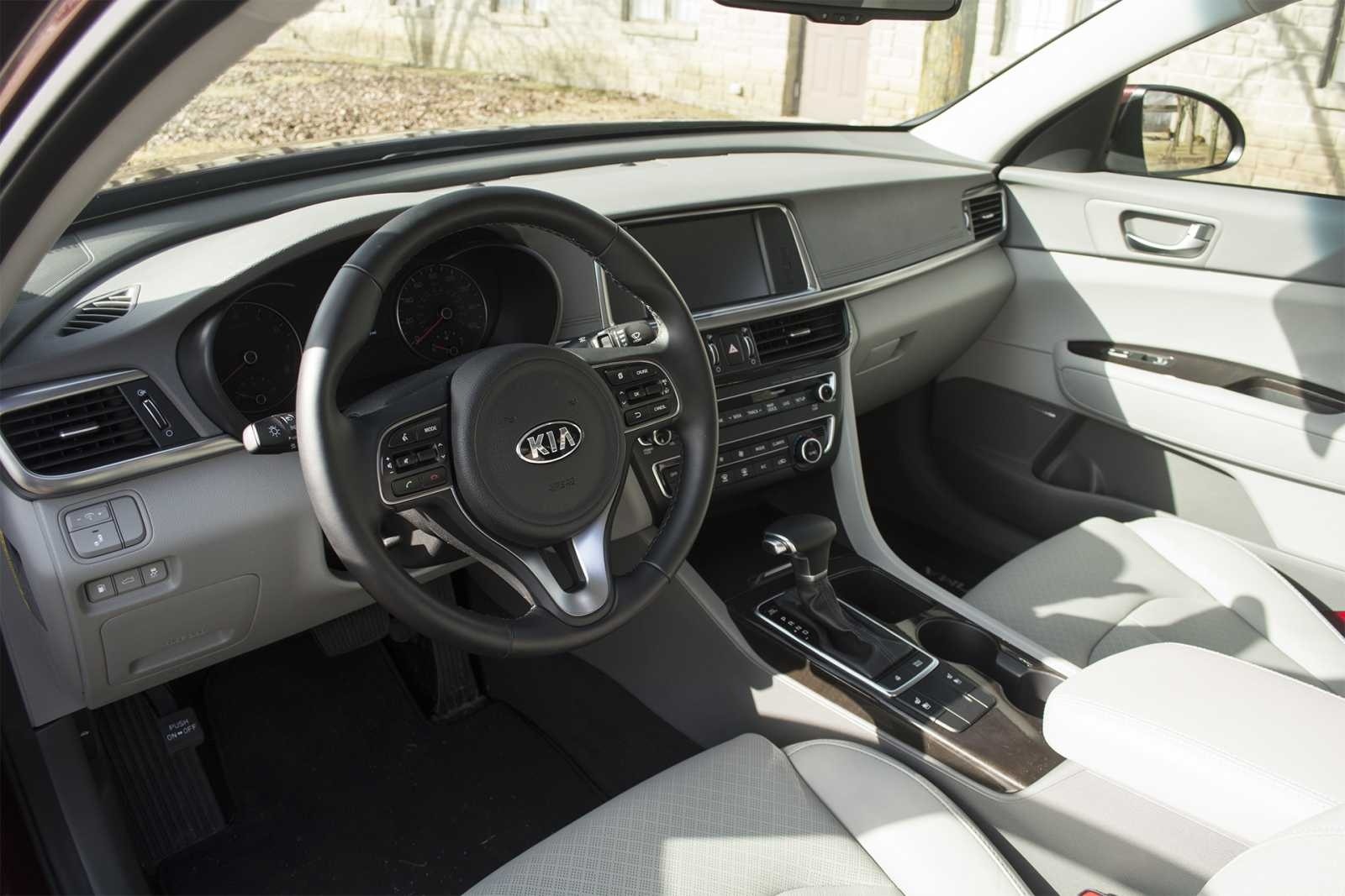 The 2016 Kia Optima EX interior features a Kia-badged flat-bottom steering wheel, a floating center infotainment display, and a light gray leather interior with wood grain center console trim. The automatic shifter and dual-zone climate controls sit within easy reach of the driver.