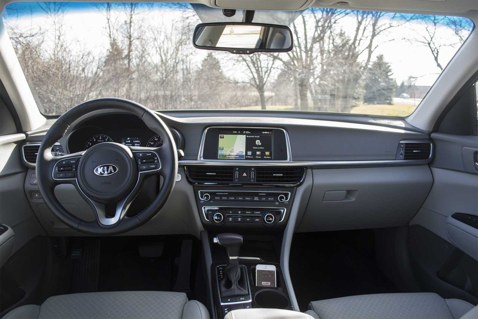 A wide view of the 2016 Kia Optima EX's front cabin shows the full dashboard layout with a central touchscreen infotainment display showing navigation, a Kia-badged multi-function steering wheel, and light gray cloth seats. Dual climate vents and an automatic shifter are centrally positioned.