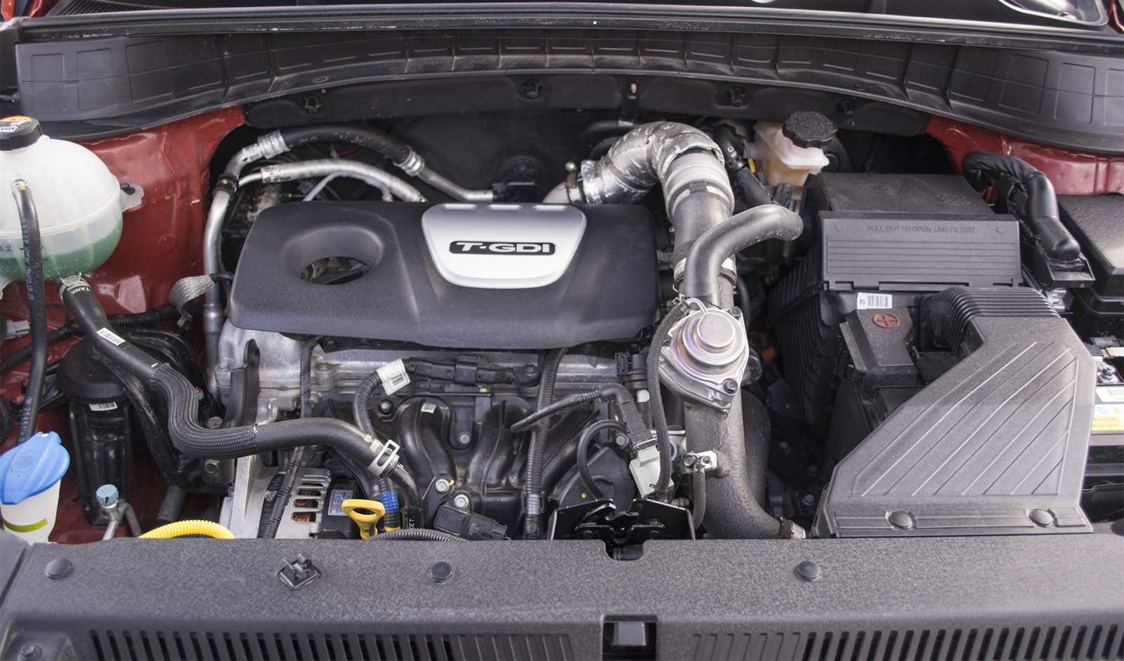 The engine bay of the 2016 Hyundai Tucson Limited AWD reveals the 1.6-liter T-GDI turbocharged four-cylinder engine identified by the T-GDI badge on the valve cover. The turbocharger, intercooler piping, and air intake assembly are prominently visible alongside fluid reservoirs and the battery.