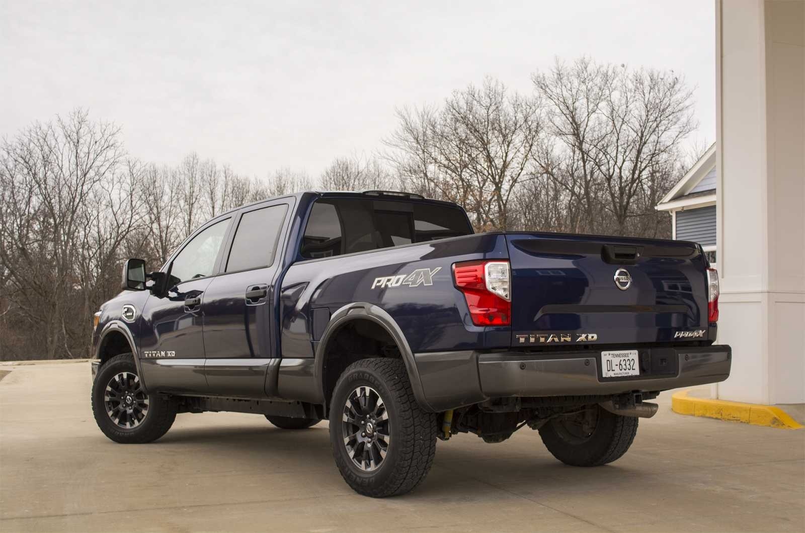 Rear three-quarter view of the blue 2016 Nissan Titan XD Pro-4X at a building showing the PRO4X graphic on the bed side, TITAN XD badge on the tailgate, Tennessee manufacturer plate DL-6332, and the truck's dark alloy wheels with all-terrain tires.