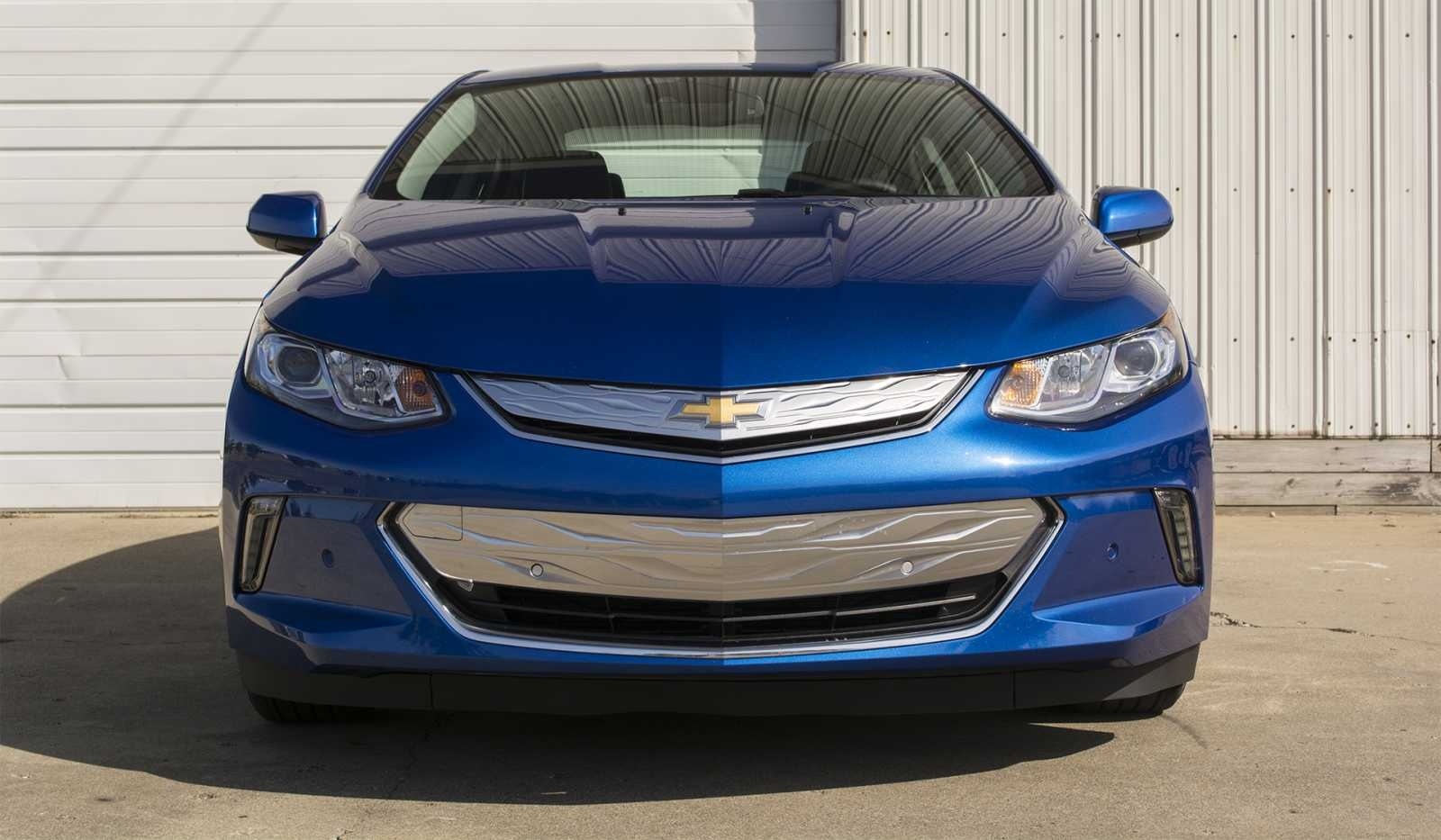Head-on, the 2016 Chevrolet Volt Premier presents a wide, low front fascia with a nearly closed upper grille opening flanked by projector headlamps, a prominent gold bowtie center emblem, and a large lower mesh intake opening that feeds cooling air to the Voltec hybrid powertrain.