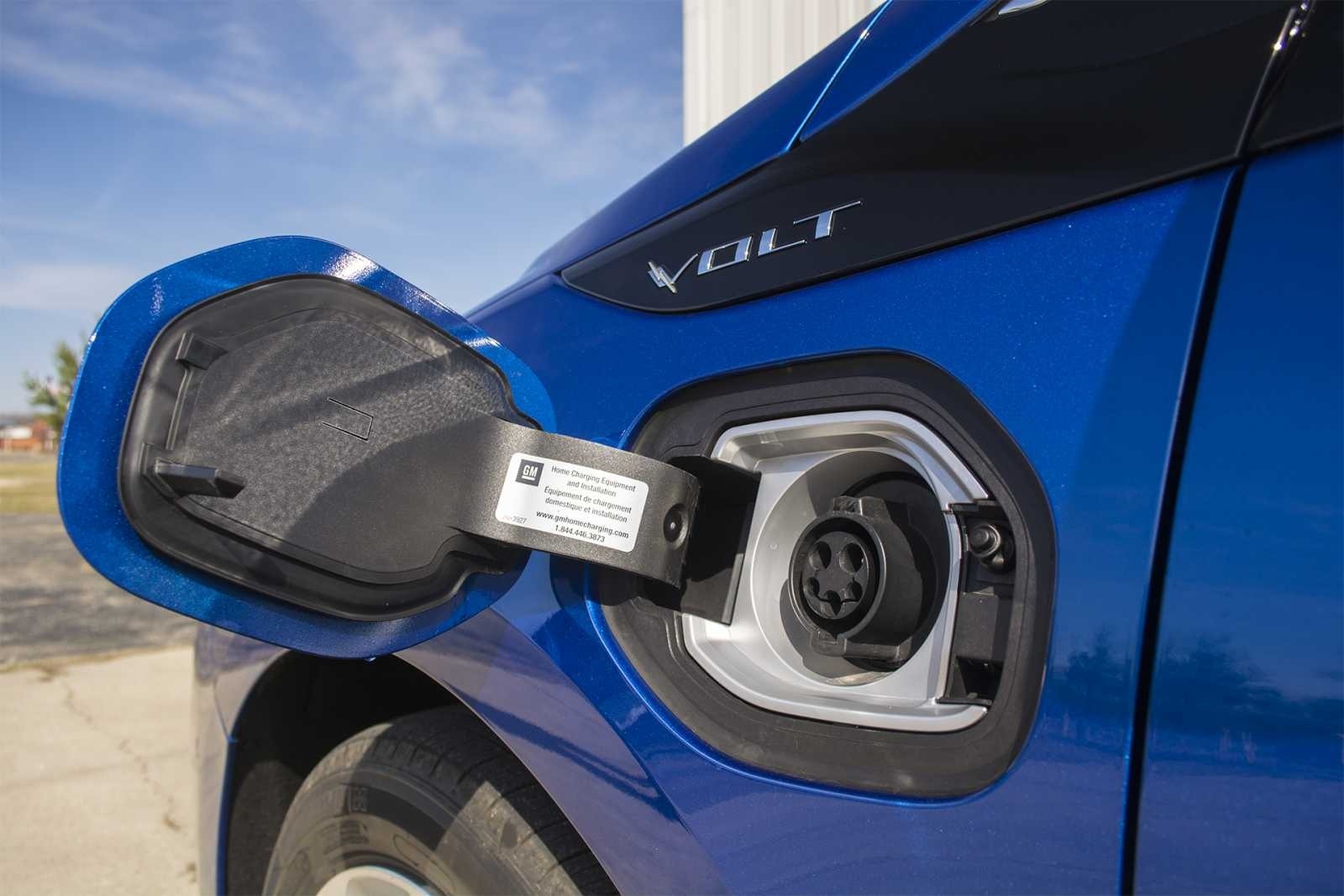 The open charge port door on the 2016 Chevrolet Volt Premier reveals the J1772 AC charging socket on the driver's side front fender, flanked by the chrome "VOLT" badge, allowing the plug-in hybrid to accept Level 1 or Level 2 charging to replenish its 18.4-kWh lithium-ion battery pack.