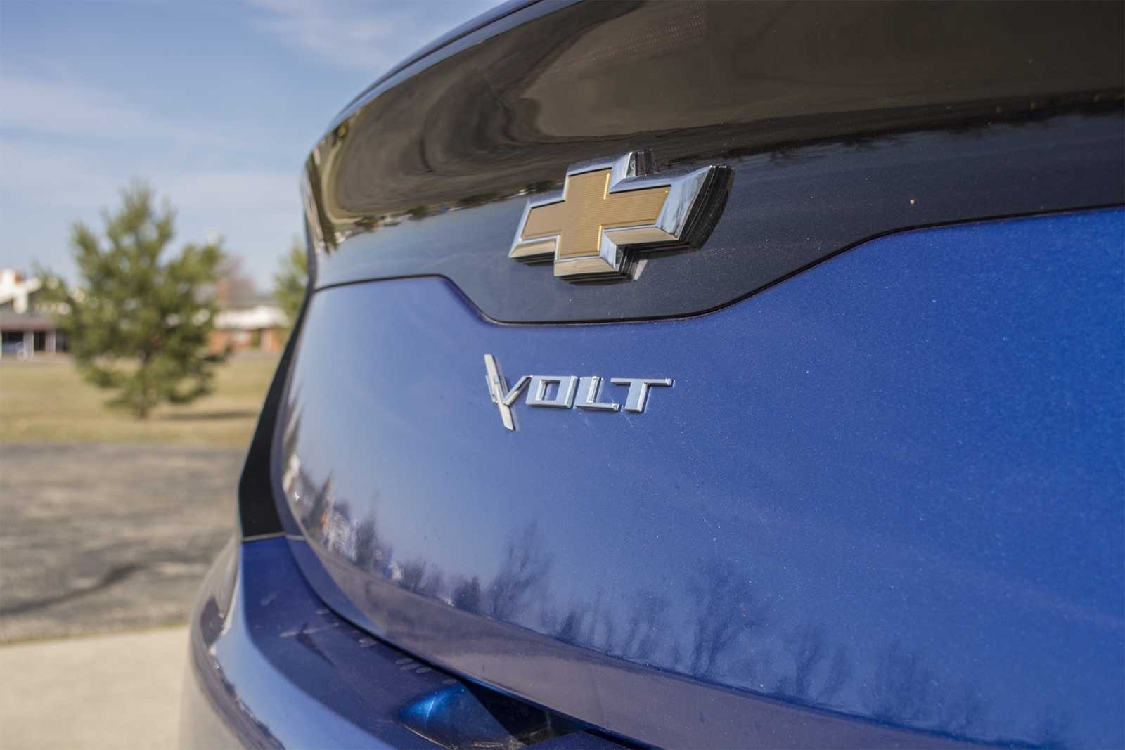 A close-up of the 2016 Chevrolet Volt Premier's rear decklid shows the chrome "VOLT" script badge directly below the gold Chevy bowtie emblem, set against the Kinetic Blue Metallic paint and black rear glass spoiler that gives the plug-in hybrid its distinctive fastback profile.