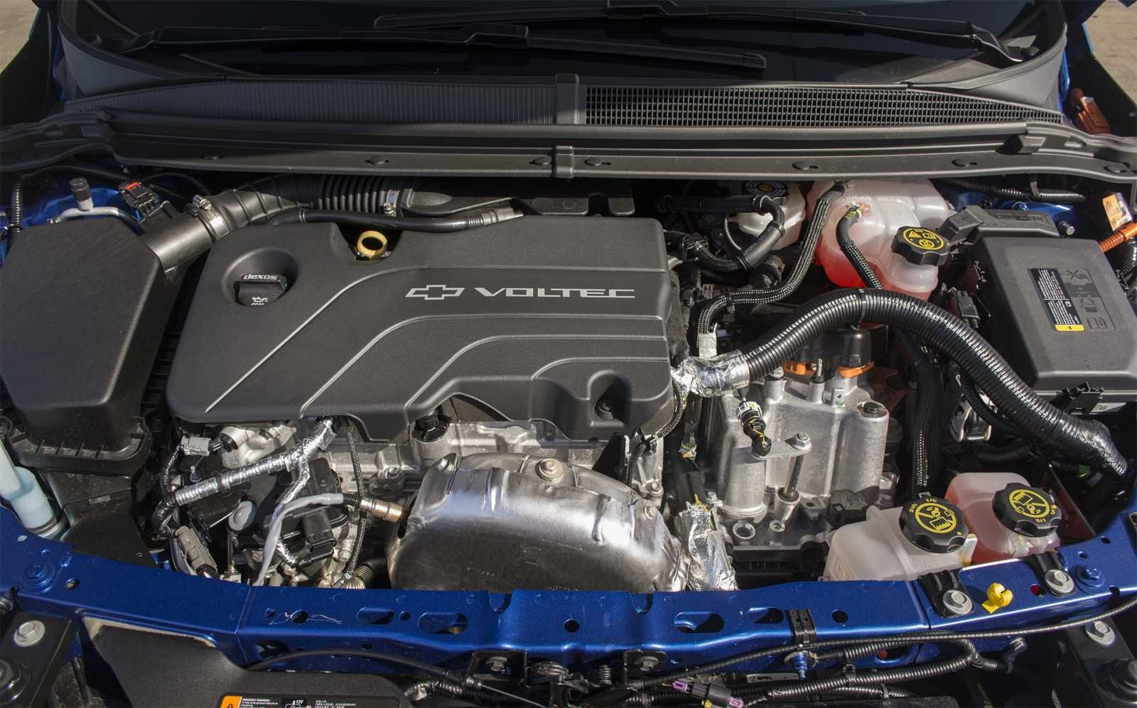 The engine bay of the 2016 Chevrolet Volt Premier is dominated by the Chevrolet Voltec plug-in hybrid powertrain, identifiable by the prominent "Voltec" lettering on the engine cover, combining a 1.5-liter range-extending generator with two electric motors for a combined output of 149 horsepower.
