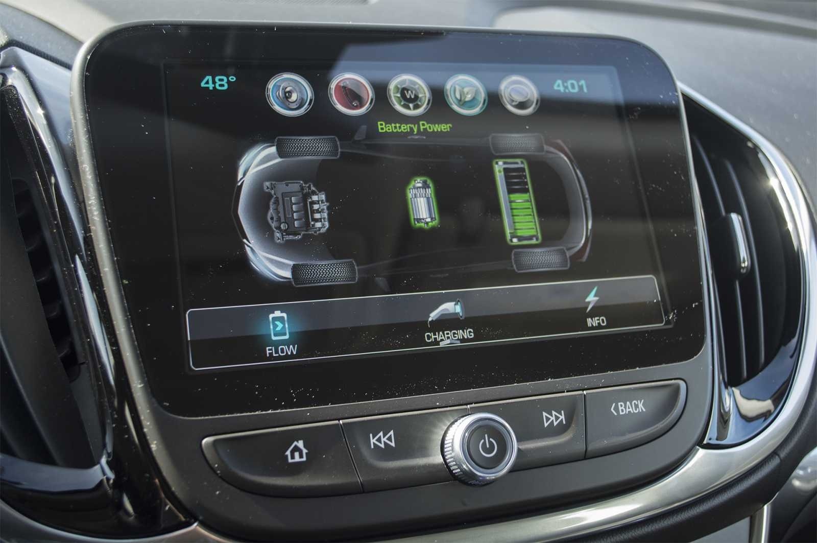 The 2016 Chevrolet Volt Premier's MyLink infotainment system displaying the Battery Power energy flow diagram, showing the real-time flow between the electric motor, battery, and wheels with FLOW, CHARGING, and INFO tab options.