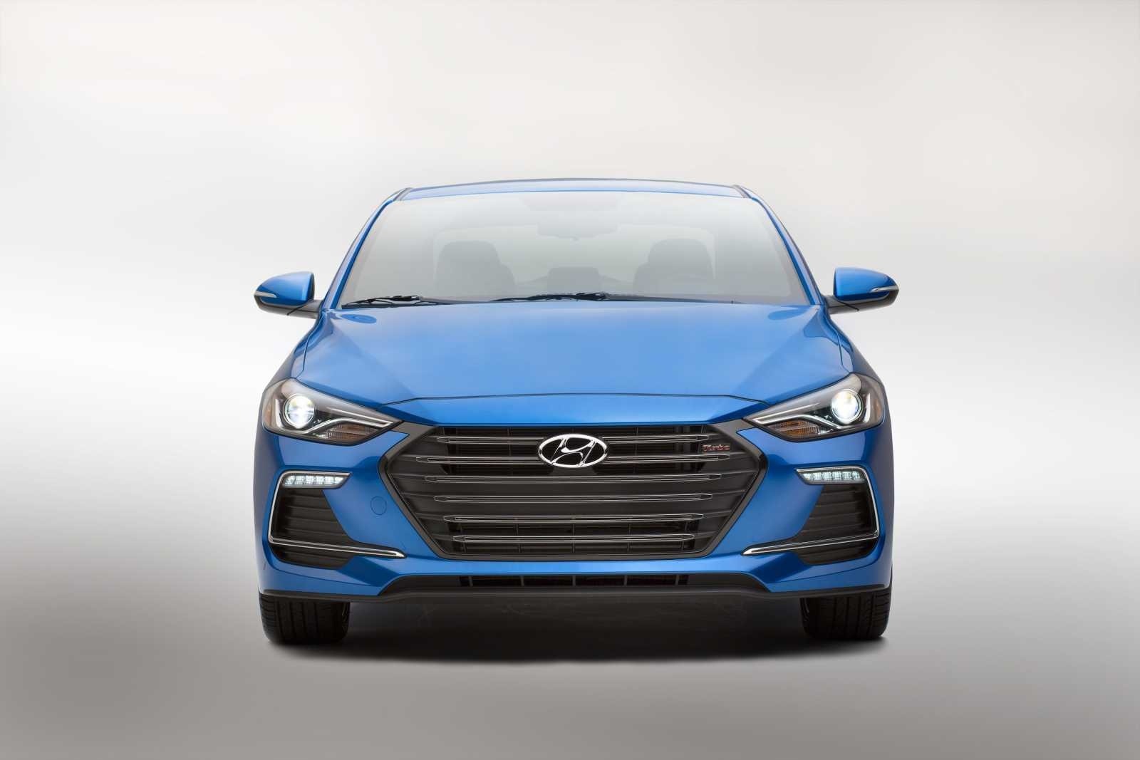 Studio photograph of the 2017 Hyundai Elantra Sport from the front, finished in Performance Blue against a white gradient background. The Sport trim's aggressive front fascia features a dark honeycomb grille with centered Hyundai H badge, projector headlights, and LED daytime running lights.