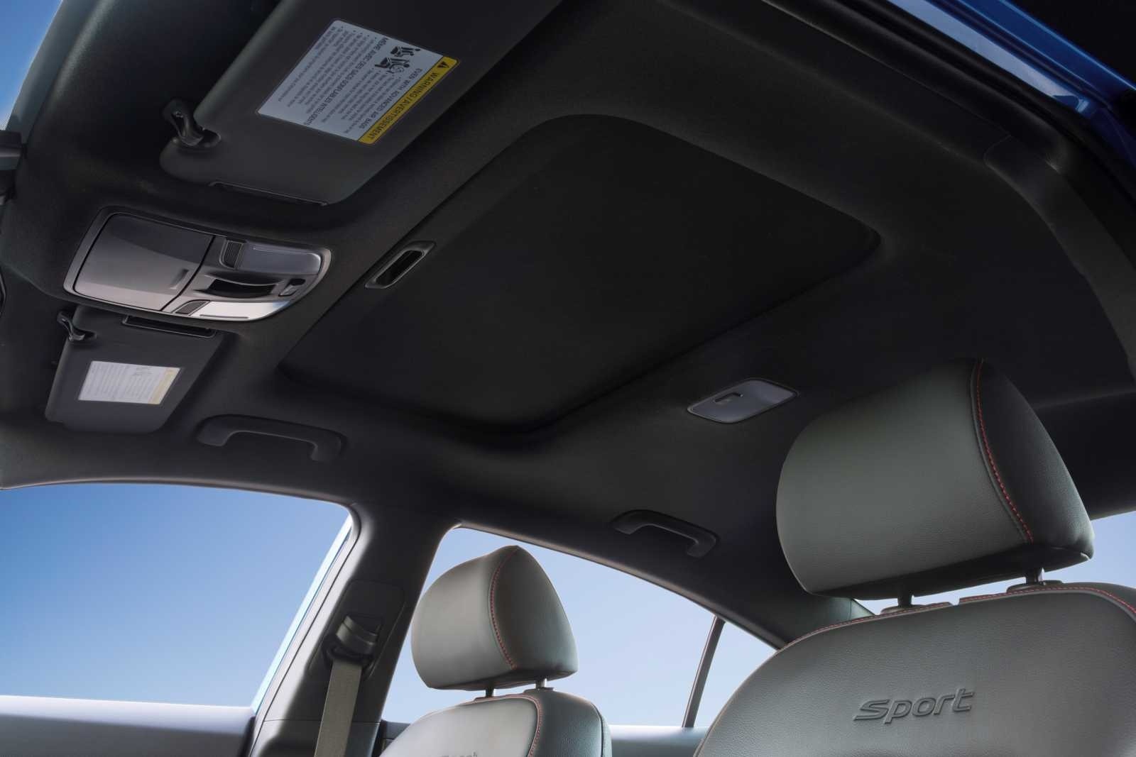 The 2017 Hyundai Elantra Sport interior shot shows the panoramic sunroof shade in the closed position, with the dark headliner and sun visors framing the cabin, while the leather front seat headrests with "Sport" embossing and red stitching are visible below.