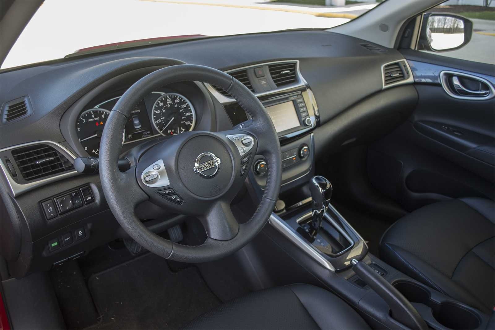The driver-focused cockpit of the 2016 Nissan Sentra SR features a leather-wrapped steering wheel, a 5-inch infotainment screen, and a CVT gear selector with silver accent trim. Black sport seats and silver door trim accents complete the interior.