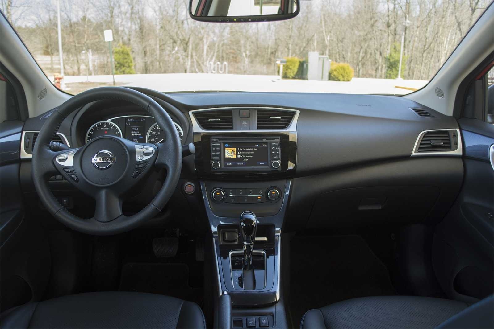 The full dashboard of the 2016 Nissan Sentra SR showcases the 7-inch touchscreen infotainment system, silver accent trim spanning the width of the dash, and climate controls below the center screen. Black soft-touch surfaces and a CVT gear shifter complete the cabin.