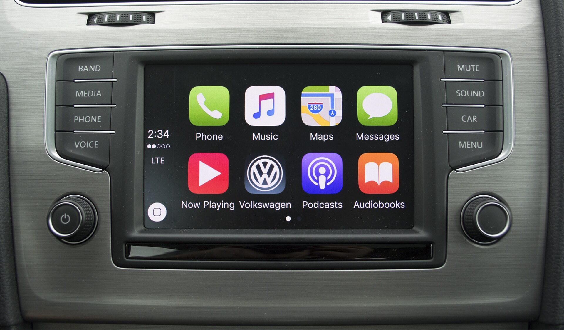 The 6.5-inch touchscreen in the 2016 Volkswagen Golf SportWagen SE displays the Apple CarPlay interface with icons for Phone, Music, Maps, Messages, Podcasts, and Audiobooks. Physical shortcut buttons for Band, Media, Phone, and Voice flank both sides of the screen.