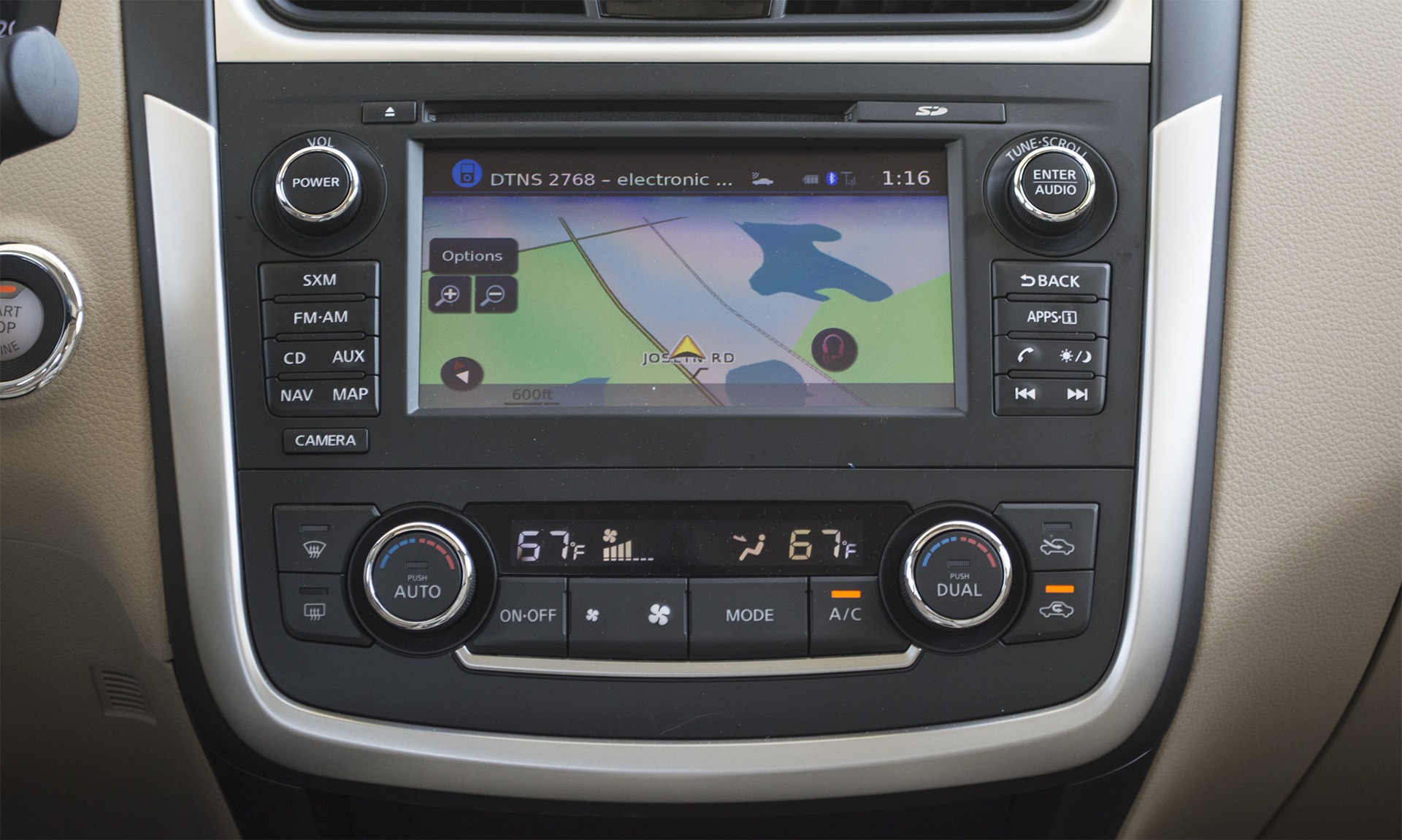 A close-up of the center stack in the 2016 Nissan Altima 2.5 SL shows the NissanConnect navigation interface on the touchscreen and the dual-zone automatic climate control panel below. Hard buttons for SiriusXM, FM/AM, CD, Aux, and NAV functions flank the screen on both sides.