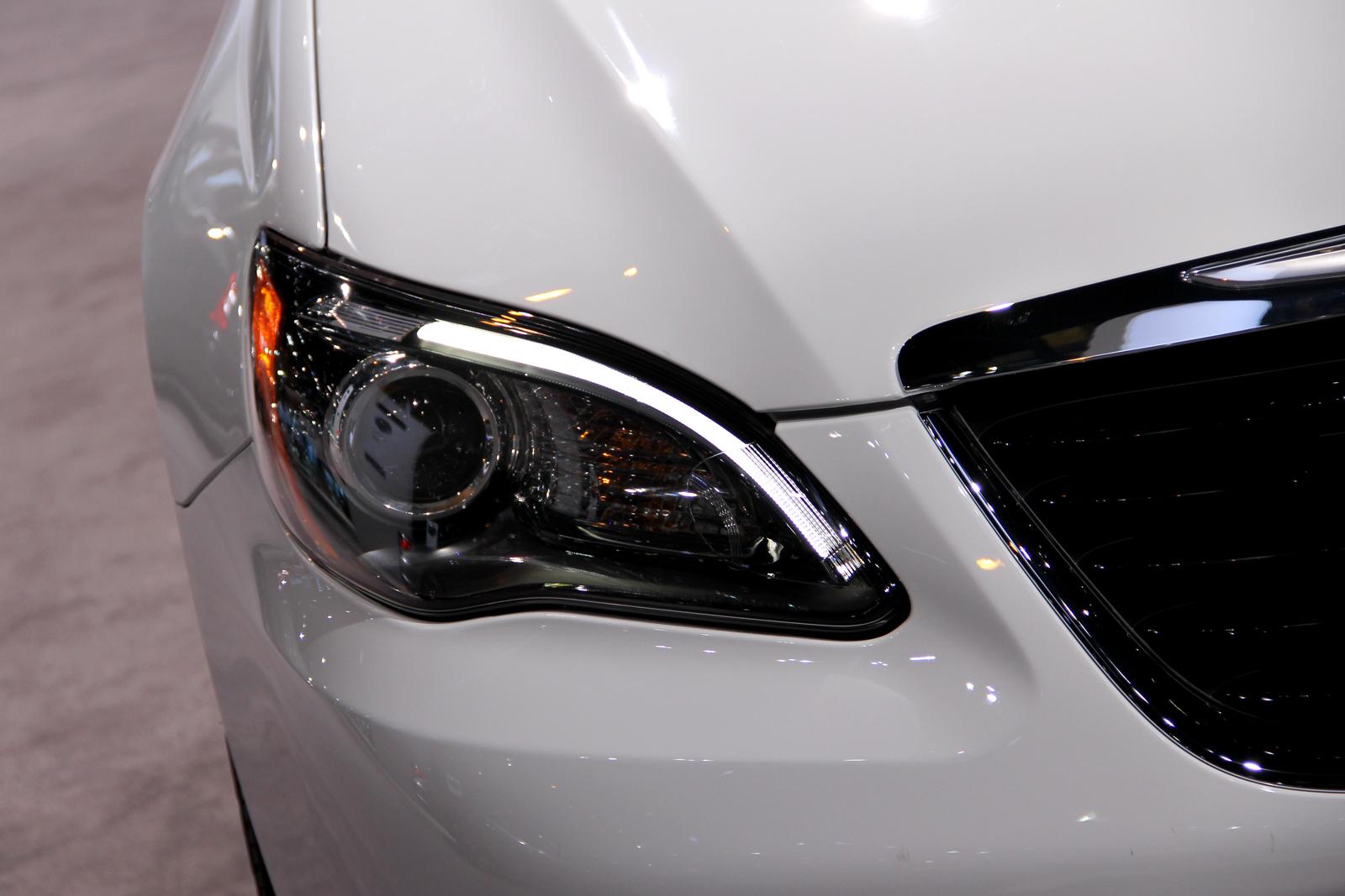 Close-up detail of the projector headlight and blacked-out grille on the 2011 Chrysler 200 S sedan, captured at the 2011 Chicago Auto Show. The swept headlight design and aggressive front fascia gave the 200 S a sportier look than the standard 200.