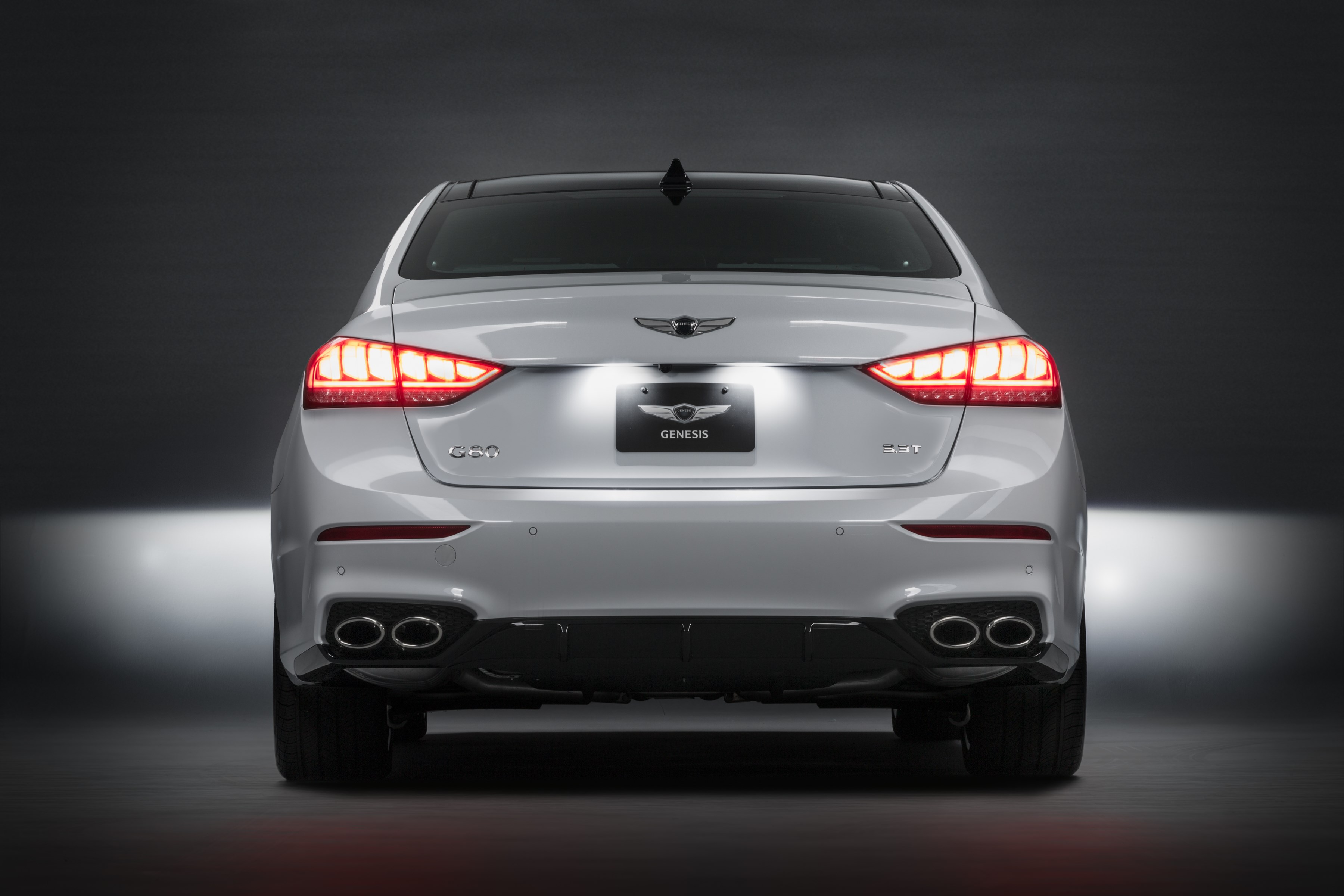 2018 Genesis G80 Sport White Rear View Showing Quad Exhaust Tips