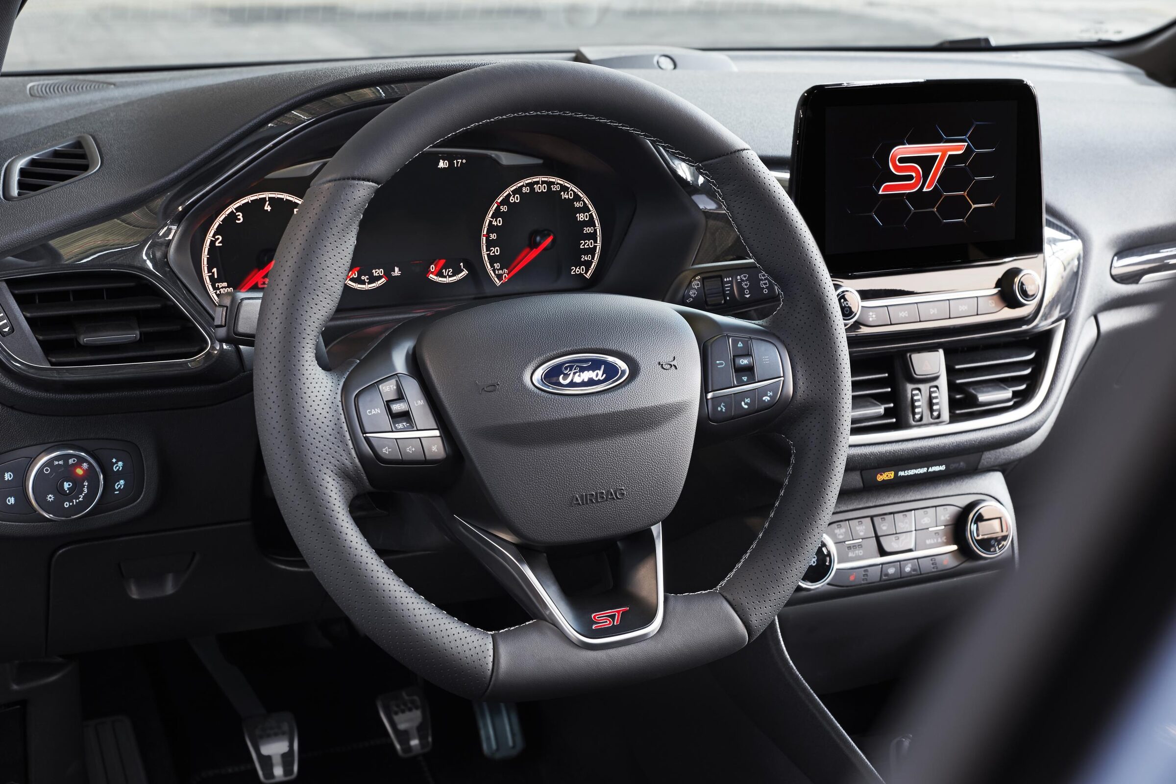 2018 Ford Fiesta ST driver cockpit with ST-branded steering wheel and touchscreen