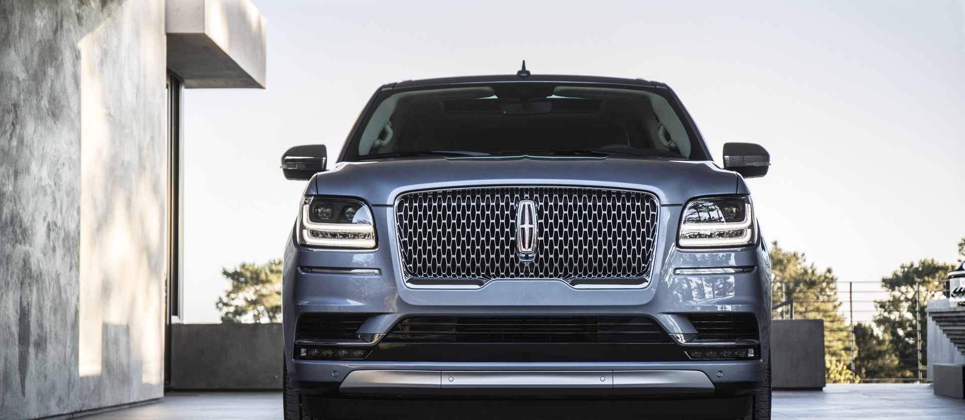 An official press photo of the 2018 Lincoln Navigator shot head-on against a modern architectural background, showcasing the wide mesh grille with Lincoln star emblem, split-wing LED headlights, and lower air intake, released for the 2017 New York International Auto Show debut.