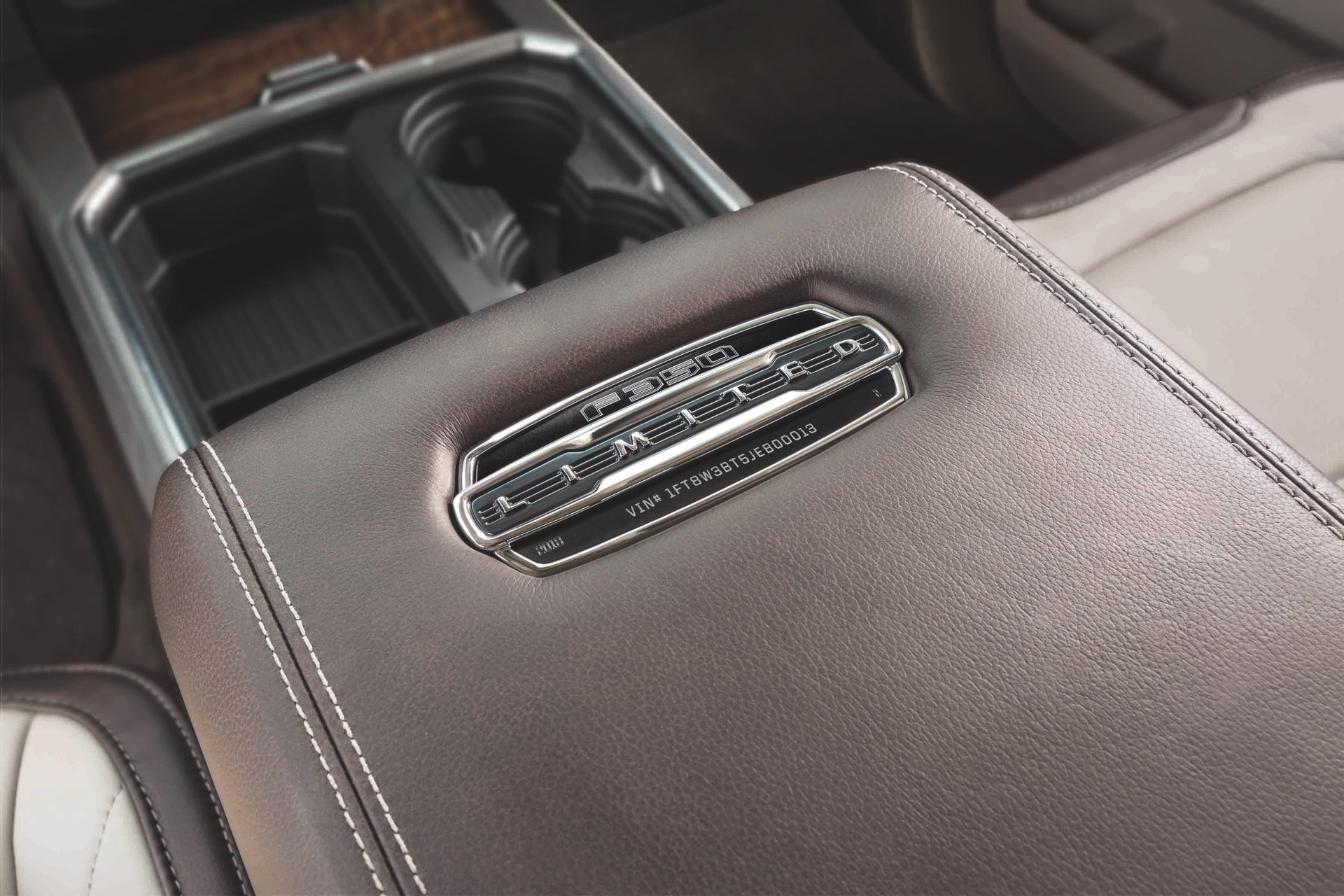 A close-up of the "Limited" badge embossed on the center console armrest of the 2018 Ford F-450 Super Duty Limited, finished in two-tone brown and cream leather with contrast stitching. The exclusive badging underscores the truck's top-tier trim status.